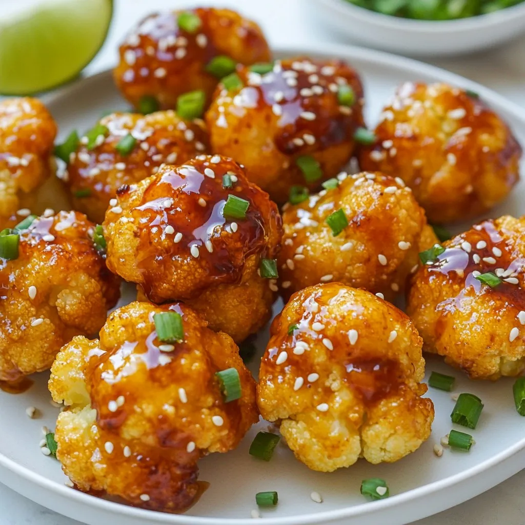 Crispy cauliflower bites coated in a sweet and spicy honey Sriracha sauce, perfect as an appetizer or snack.