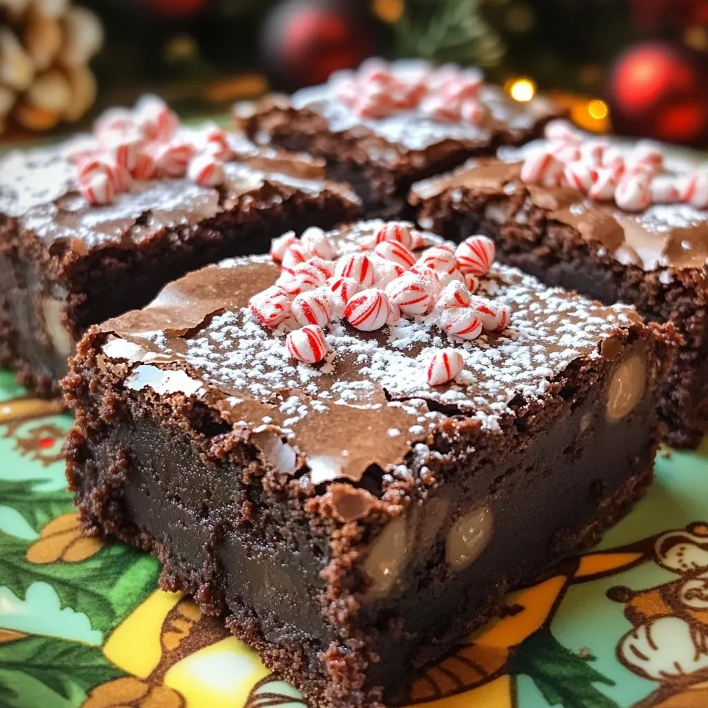 - 1 cup unsalted butter, melted - 2 cups granulated sugar - 4 large eggs - 1 teaspoon vanilla extract - 1/2 teaspoon peppermint extract - 1 cup all-purpose flour - 1/2 cup unsweetened cocoa powder - 1 teaspoon baking powder - 1/2 teaspoon salt - 1 cup semi-sweet chocolate chips - 1 tablespoon instant coffee granules - 2 tablespoons hot water - Crushed peppermint candies for topping - Unsalted butter: 1 cup, melted - Granulated sugar: 2 cups - Large eggs: 4 - Vanilla extract: 1 teaspoon - Peppermint extract: 1/2 teaspoon - All-purpose flour: 1 cup - Unsweetened cocoa powder: 1/2 cup - Baking powder: 1 teaspoon - Salt: 1/2 teaspoon - Semi-sweet chocolate chips: 1 cup - Instant coffee granules: 1 tablespoon - Hot water: 2 tablespoons - Crushed peppermint candies: for topping Using quality ingredients makes a big difference in your brownies. Fresh eggs add richness. Good butter brings a creamy texture. High-quality chocolate chips melt beautifully, giving that rich, fudgy bite. The cocoa powder needs to be unsweetened for the best flavor. Don’t skip on the extracts! They are key to enhancing that peppermint and mocha taste. Fresh crushed peppermint candies not only look great but add a nice crunch. These choices ensure your brownies taste just like they came from a bakery. Start by preheating your oven to 350°F (175°C). This helps your brownies bake evenly. Next, take a 9x13-inch baking pan. Lightly grease it or line it with parchment paper. This makes it easy to take the brownies out later. In a large bowl, pour in 1 cup of melted butter. Add 2 cups of granulated sugar. Whisk them together until the mixture is smooth. Then, add 4 large eggs one by one. Make sure to whisk well after each egg. This helps create a fluffy batter. Next, pour in 1 teaspoon of vanilla extract and 1/2 teaspoon of peppermint extract. Mix until everything is blended. In another bowl, sift together 1 cup of all-purpose flour, 1/2 cup of cocoa powder, 1 teaspoon of baking powder, and 1/2 teaspoon of salt. Gradually add this dry mixture to the wet ingredients. Stir gently until just combined. Be careful not to overmix, or the brownies may become tough. Take 1 tablespoon of instant coffee granules and dissolve it in 2 tablespoons of hot water. Once dissolved, fold this into your brownie batter. This step enhances the mocha flavor. Next, gently fold in 1 cup of semi-sweet chocolate chips. Make sure they are evenly mixed in. Pour the brownie batter into the prepared pan. Use a spatula to spread it evenly. Then, sprinkle crushed peppermint candies on top. Place the pan in the oven and bake for 25-30 minutes. To check if they are done, insert a toothpick into the center. If it comes out with a few moist crumbs, the brownies are ready. After baking, let them cool in the pan for at least 20 minutes before slicing. To get fudgy brownies, use melted butter instead of softened butter. Melted butter adds moisture and richness. Also, do not overmix the batter. Stir just until combined for a dense texture. Bake at 350°F, and test with a toothpick. It should have moist crumbs, not clean. Start with the wet ingredients first. Whisk melted butter and sugar until smooth. Add eggs one at a time, mixing well after each. This helps the brownies rise evenly. When adding dry ingredients, fold gently. Overmixing leads to tough brownies. Use a 9x13-inch baking pan for even cooking. A whisk works best for mixing wet ingredients. A rubber spatula is great for folding and scraping the bowl. Keep a toothpick handy for testing doneness. Parchment paper makes it easy to lift out brownies. For a lovely presentation, slice brownies into squares. Dust them with powdered sugar for a sweet touch. Add a sprinkle of crushed peppermint candies on top. Serve on a festive plate to enhance the holiday spirit. Enjoy your delicious creation! {{image_4}} You can change the flavor of these brownies easily. For a nutty twist, add chopped walnuts or pecans. This adds great texture and flavor. If you want a hint of orange, use orange zest. It gives a fresh, bright taste. You can also swap the peppermint extract for almond extract for a unique flavor. The options are endless! To make gluten-free brownies, use almond flour or a gluten-free baking mix. Replace all-purpose flour with these options in equal amounts. This keeps the brownies soft and chewy. You may need to add an extra egg to help bind the mix. These adjustments keep the rich flavor while making them gluten-free. You can easily make these brownies vegan. Replace the eggs with flax eggs. Just mix one tablespoon of ground flaxseed with three tablespoons of water. Let it sit for five minutes until it thickens. Use a plant-based butter or coconut oil instead of regular butter. You can also use dairy-free chocolate chips to make them fully vegan. Enjoy the same great taste without any animal products! To keep your brownies fresh, let them cool. Once cool, cut them into squares. Place them in a single layer in a container. This helps prevent sticking. Cover them tightly with a lid or plastic wrap. Store them at room temperature for up to four days. If you want them to last longer, refrigerate them. In the fridge, they can stay fresh for about a week. The best container for storing your brownies is an airtight one. Use a glass or plastic container with a tight seal. This keeps moisture out and helps maintain their fudgy texture. If you don’t have a container, you can wrap each brownie individually in plastic wrap. This option is great for on-the-go snacking. You can freeze brownies for later enjoyment. To freeze, wrap each square in plastic wrap. Then, place them in a freezer bag. Remove as much air as possible before sealing. Brownies can be frozen for up to three months. When you’re ready to eat them, thaw them in the fridge overnight. For a warm treat, reheat them in the microwave for about 15-20 seconds. Enjoy your delicious brownies anytime! Yes, you can use different extracts. Try using almond or or