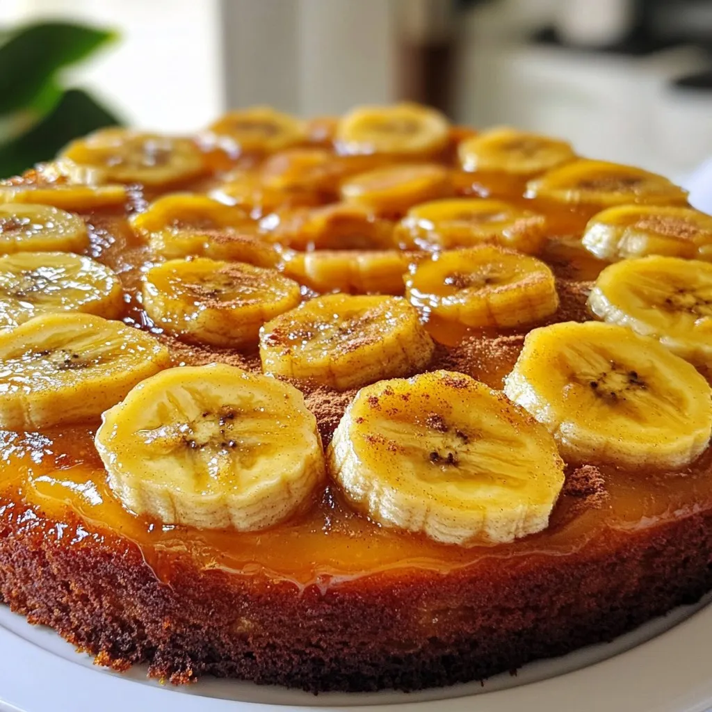 A delightful upside-down cake featuring ripe bananas and a caramelized brown sugar topping.