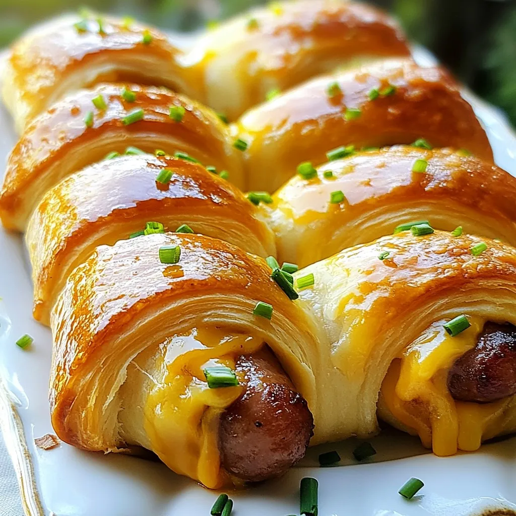 A delicious breakfast treat featuring sausages wrapped in crescent roll dough, topped with cheese and a sweet maple drizzle.