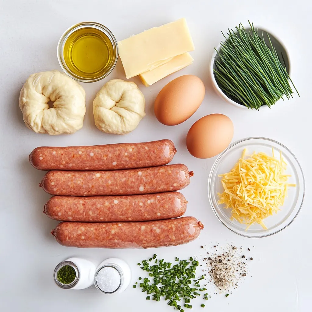 These ingredients form the base of your breakfast pigs in a blanket. The breakfast sausages provide savory flavor. The crescent roll dough adds a light, flaky texture. Eggs and milk create a rich topping, while cheese and chives add depth and brightness.