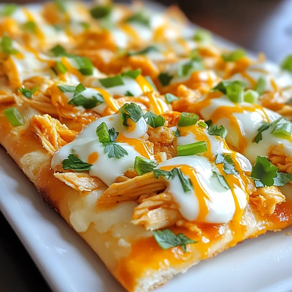Serve your flatbread hot from the oven. Present it on a large cutting board for a fun look. Offer a small bowl of extra buffalo sauce for dipping. This adds a nice touch for those who love extra heat. Pair it with a fresh salad or veggie sticks for a balanced meal. Enjoy this dish as a snack, lunch, or a party treat!