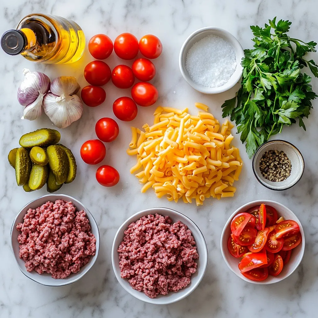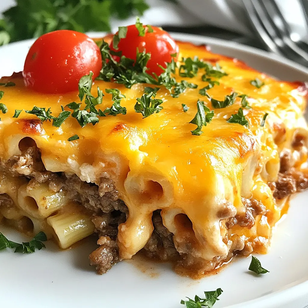 To make this tasty dish, gather these main ingredients: - 1 lb ground beef - 1 small onion, finely diced - 2 cloves garlic, minced - 1 cup cherry tomatoes, halved - 1 cup dill pickles, diced - 1 cup shredded sharp cheddar cheese - 1 cup elbow macaroni pasta - 2 cups beef broth - 1 tablespoon Worcestershire sauce - 1 teaspoon mustard (yellow or Dijon) - Salt and freshly ground black pepper to taste - 1 tablespoon extra virgin olive oil These ingredients create a rich and hearty flavor. The ground beef gives protein, while the cheese adds creaminess. The pasta makes it filling and comforting. You can elevate your casserole with these optional toppings: - Additional shredded cheddar cheese - Crispy bacon bits - Sliced green onions - Fresh herbs like parsley or chives These toppings add flavor and texture. They also make your dish look more appealing. A sprinkle of fresh herbs brightens the plate. Pair your cheeseburger casserole with these side dishes: - Simple green salad - Garlic bread - Steamed broccoli - French fries These sides complement the casserole well. They offer balance and variety to your meal. Enjoying a side can enhance your overall dining experience. {{ingredient_image_2}} First, you need to preheat your oven to 350°F (175°C). This step is key. A hot oven helps the casserole cook evenly. While your oven heats, gather your tools. You will need a large skillet and a baking dish. A 9x13 inch dish works best here. In your large skillet, add one tablespoon of extra virgin olive oil. Heat it over medium heat. Once hot, add one small onion, finely diced, and two cloves of minced garlic. Sauté these for about 3-4 minutes. You want the onion to be soft and clear. Next, add one pound of ground beef. Use a spatula to break it into small pieces. Cook for about 5-7 minutes. The beef should be brown with no pink spots. If there is fat, drain it off carefully. Stir in one tablespoon of Worcestershire sauce and one teaspoon of mustard. Season with salt and freshly ground black pepper. Mix everything well. In a large pot, combine one cup of elbow macaroni and two cups of beef broth. Bring this to a boil. Once boiling, lower the heat. Let it simmer for 7-8 minutes. Check the macaroni; it should be tender but still firm. This is called al dente. When it’s ready, you can move on to the next step. To boost flavor, use fresh ingredients. Fresh garlic and onion make a big difference. Sauté them until soft to release their natural sweetness. Add Worcestershire sauce for depth and richness. This sauce brings a savory umami flavor that enhances the beef. Also, mix in some mustard. It gives a nice tang and brightens the dish. To keep your pasta firm, cook it al dente. Boil it in beef broth for extra flavor. Watch the cooking time closely. You want the pasta tender but not mushy. Drain it well before mixing it with the beef. This helps keep the texture just right. Remember, the pasta will continue to cook in the oven. When serving, scoop the casserole onto plates or bowls. Make sure to show off that melted cheese on top. Add a sprinkle of fresh parsley for color. This not only looks great but also adds freshness. Pair your casserole with a crisp salad or some warm bread. This makes a perfect meal for family and friends. Pro Tips Use Lean Ground Beef: Using lean ground beef (such as 90% lean) will reduce excess grease in your casserole, making it healthier and preventing a greasy texture. Cheese Variations: Feel free to mix different types of cheese, like mozzarella or pepper jack, for a unique flavor profile and added creaminess. Make It Ahead: This casserole can be assembled ahead of time and stored in the refrigerator for up to 24 hours before baking, making it perfect for meal prep. Garnish Creatively: Enhance the presentation by adding sliced green onions or crispy bacon bits along with the parsley for a burst of flavor and color. {{image_4}} You can change the cheese to mix up the taste. Try using mozzarella for a milder flavor. Crumbled feta adds a tangy kick. Pepper jack gives a spicy twist. For a rich taste, go with gouda. Each choice creates a new experience in your cheeseburger casserole. If you need to swap ingredients, it’s easy to adapt. Use ground turkey or chicken instead of beef for a leaner option. For a vegetarian version, try lentils or a meat substitute. Gluten-free pasta works well if you avoid gluten. You can also use vegetable broth instead of beef broth. Toppings can make your casserole even better. Add crispy bacon bits for crunch. Sliced jalapeños bring heat and flavor. For a fresh touch, try diced bell peppers or green onions. Sprinkle crushed tortilla chips on top for added texture. Get creative and make it your own! To store leftover cheeseburger casserole, wait for it to cool. Then, place it in an airtight container. You can keep it in the fridge for up to three days. If you want it to last longer, freezing is a great option. Just make sure to cover it well to prevent freezer burn. When you’re ready to enjoy leftovers, preheat your oven to 350°F (175°C). Place the casserole in an oven-safe dish and cover it with foil. Heat for about 20-25 minutes until it’s hot all the way through. This method keeps the cheese nice and melty. You can also use the microwave. Heat in short intervals, checking often to avoid overheating. To freeze your cheeseburger casserole, first let it cool completely. Cut it into portions for easy serving later. Wrap each portion in plastic wrap, then place them in a freezer bag. This keeps the casserole fresh for up to three months. When you’re ready to eat, thaw it in the fridge overnight before reheating. This way, you’ll enjoy that comforting taste just like fresh! If you want a different meat, you can use ground turkey or chicken. Both work well and keep the dish light. You can also try plant-based options like lentils or beans. These choices add protein and fiber. Just make sure to season them to keep the flavor strong. Yes, you c