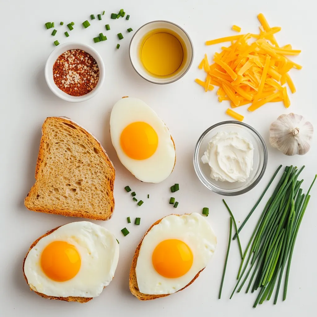 These ingredients come together to create a delightful dish. Whole-grain bread gives a hearty base. Eggs provide protein, while the cheeses add creaminess and flavor. Garlic and paprika bring a nice kick. Lastly, chives add a fresh touch.