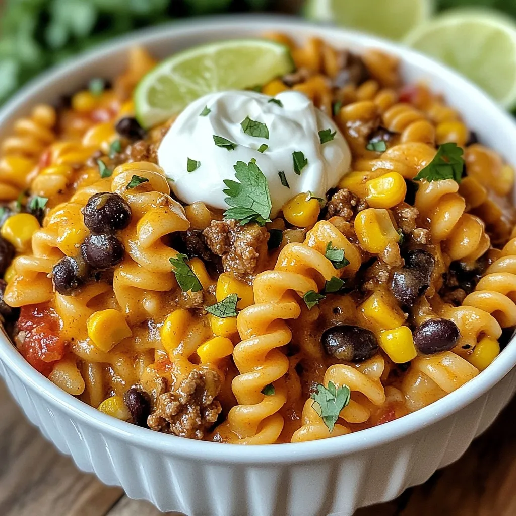 A delicious and easy one-pot pasta dish with taco flavors, cheese, and a variety of ingredients.