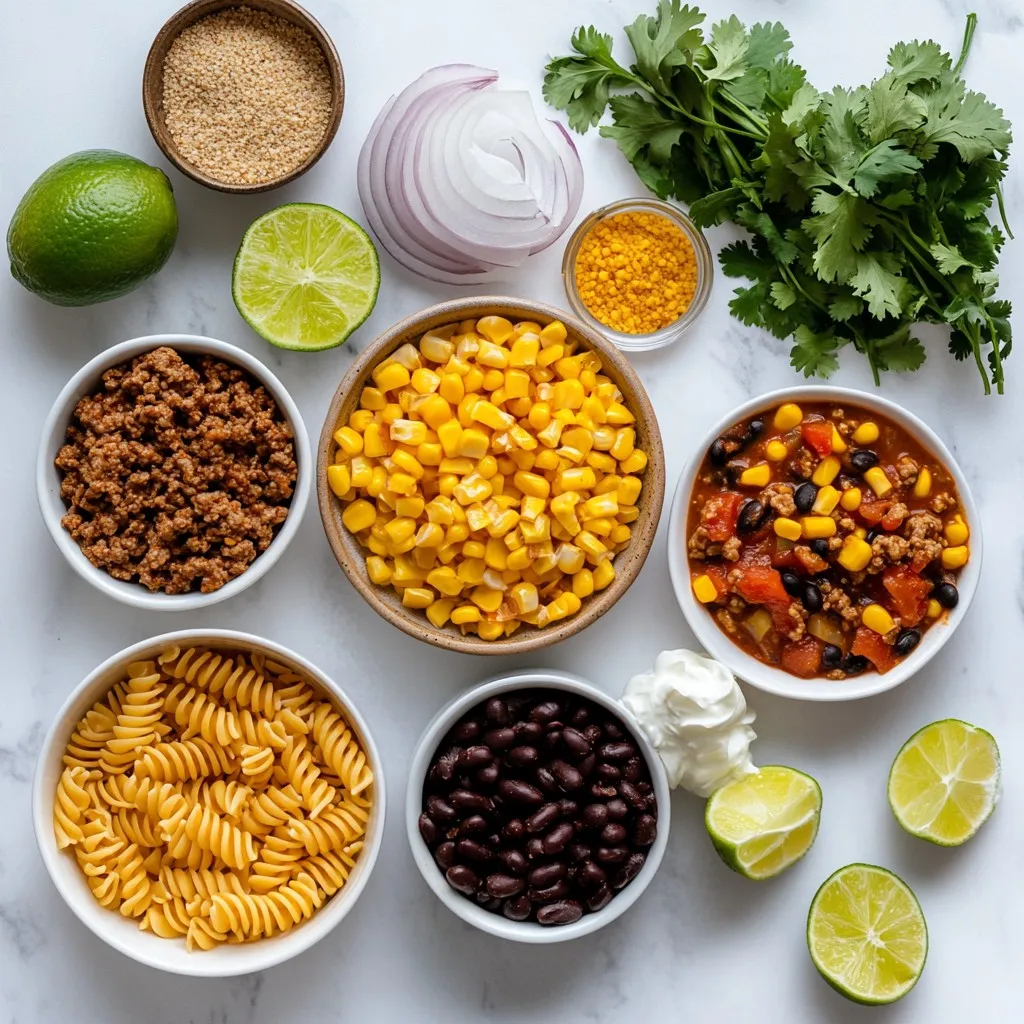 For a tasty Cheesy One Pot Taco Pasta, gather these ingredients: