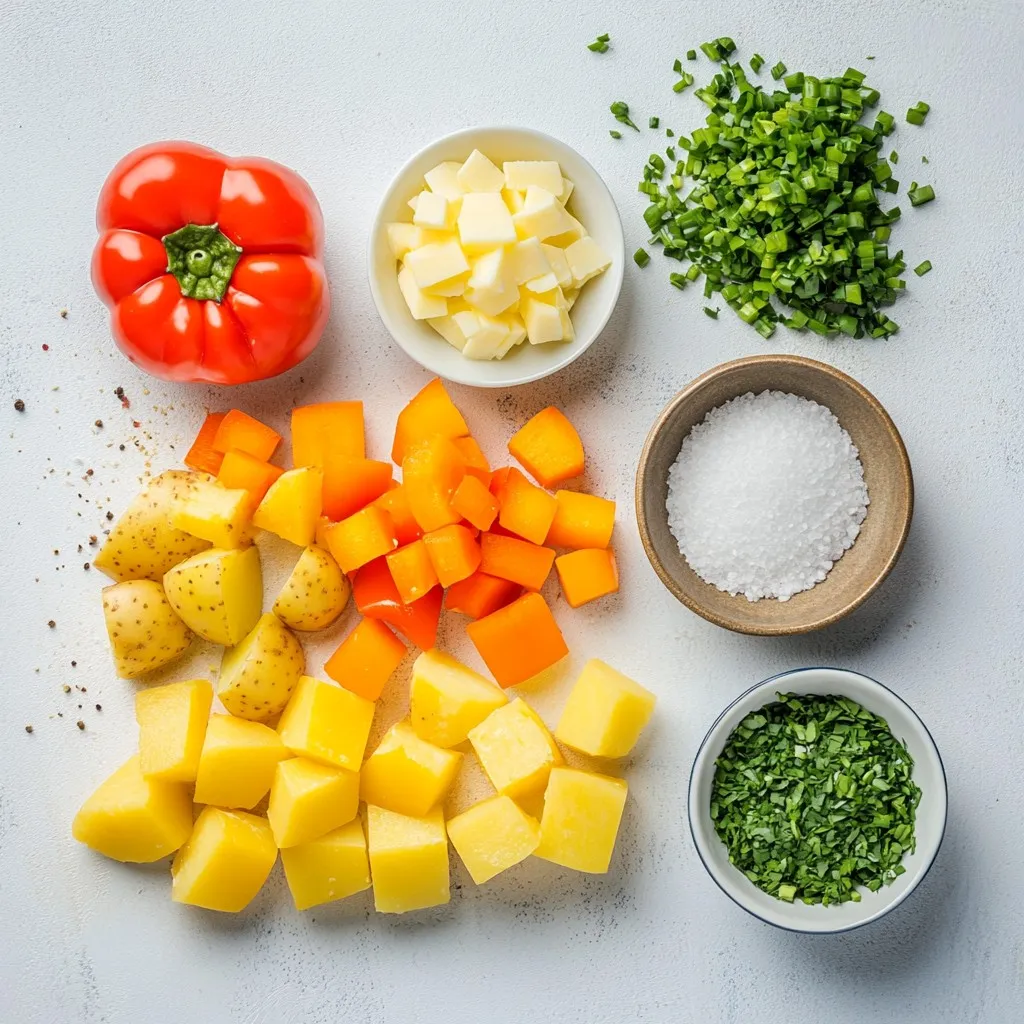 To make a tasty Cheesy Potato Egg Scramble, you need these simple ingredients: - 3 medium potatoes, peeled and diced - 4 large eggs - 1 cup shredded cheddar cheese - 1/2 cup milk - 1 small onion, finely chopped - 1 bell pepper (any color), diced - 2 tablespoons olive oil - Salt and pepper to taste - Fresh chives or parsley for garnish (optional) These ingredients come together to create a breakfast that is filling and flavorful. The potatoes give it a hearty base, while the eggs add protein. The cheese melts beautifully, making every bite creamy and rich. Fresh veggies like onion and bell pepper add color and crunch. You can even garnish with herbs for a fresh touch. {{ingredient_image_1}} - Heat the olive oil and cook the potatoes: Start by heating two tablespoons of olive oil in a large skillet over medium heat. Add three medium potatoes, peeled and diced. Cook for about 10-12 minutes. Stir them often until they are golden brown and fork-tender. Season with a pinch of salt and pepper for taste. - Add onion and bell pepper: Next, add one small finely chopped onion and one diced bell pepper to the skillet. Cook these for another 4-5 minutes. You want the veggies to be soft and fragrant. - Whisk eggs and milk: In a mixing bowl, whisk together four large eggs and half a cup of milk. Make sure they blend well. Season this mixture with a bit of salt and pepper for extra flavor. - Pour egg mixture over potatoes: Once the potatoes and veggies are cooked, pour the egg mixture over them in the skillet. Stir gently to combine everything. - Cooking on low heat: Cook this on low heat for about 5-7 minutes. Stir occasionally. You want the eggs to cook fully but still be creamy. - Add cheddar cheese and melt: After the eggs are cooked, remove the skillet from the heat. Sprinkle one cup of shredded cheddar cheese on top. Cover the skillet for a few minutes to let the cheese melt. Give it a gentle stir once melted and adjust seasoning if needed. This Cheesy Potato Egg Scramble is easy and quick, perfect for any breakfast! To make a great scramble, focus on the heat. Use medium heat to cook the potatoes. If the heat is too high, they can burn. Aim for golden brown potatoes in about 10-12 minutes. Stir them often to cook evenly. When it comes to seasoning, don’t hold back on salt and pepper. Add a pinch while cooking the potatoes and veggies. This helps build flavor. You can also mix in some garlic powder or paprika for a kick. Just remember to keep tasting as you go! For this scramble, I recommend using Yukon Gold or Russet potatoes. They cook well and give a nice texture. Yukon Golds are creamy, while Russets are fluffy. Both work great! Before you cook, peel and dice the potatoes into small pieces. This helps them cook faster and more evenly. Rinse them in cold water to remove excess starch. This step helps keep the texture light and fluffy. Pro Tips Use Fresh Ingredients: Fresh potatoes and vegetables will enhance the flavor and texture of your dish, making it more enjoyable. Customize Your Veggies: Feel free to add or substitute other vegetables like spinach, mushrooms, or tomatoes for added nutrition and taste. Control the Creaminess: For creamier eggs, reduce the cooking time and remove them from heat while slightly undercooked; they will continue to cook in the residual heat. Perfect Cheese Melt: Covering the skillet after adding cheese helps it melt evenly and quickly without overcooking the eggs. {{image_2}} You can change the cheese for different flavors. Try mozzarella for a mild taste. Feta adds a tangy kick. Or use pepper jack for some spice. Each cheese brings a new twist. Adding vegetables boosts nutrition and flavor. Spinach, mushrooms, or zucchini work well. You can also toss in cherry tomatoes for a pop of color. Mix and match to find your favorite combo. If you need a gluten-free option, this recipe is already safe. Just ensure your cheese and milk meet the standards. You can enjoy this dish without worry. For dairy-free needs, use plant-based milk and cheese. Almond or oat milk works great. Look for dairy-free cheese that melts well. It can still taste delicious! If you want a vegan version, swap the eggs. Use chickpea flour mixed with water. This gives you a similar texture. You can also try silken tofu for added creaminess. Enjoy your tasty dish, no matter your diet! To store leftovers, let the dish cool first. Once cool, place it in an airtight container. This helps keep the flavors fresh. You can store your cheesy potato egg scramble in the fridge for up to three days. If you want to keep it longer, freezing is a good option. In the freezer, it can last up to two months. When reheating, go low and slow. Use the stove or oven to warm it up. This method keeps the eggs creamy and the potatoes tender. If you use a microwave, heat it in short bursts. Stir in between to ensure even heating. Always check that it is heated through. Enjoy your tasty breakfast anytime! You can serve this dish with fresh fruits or toast. A side of crispy bacon works great too. You might enjoy it with avocado slices for creaminess. A light salad can add a nice crunch. Yes, you can make this dish ahead of time. Just cook it fully and cool it down. Store it in the fridge for up to three days. Reheat it gently before serving. This helps keep the eggs creamy. To change the spice level, add your favorite spices. Red pepper flakes can add heat. You can also use chopped jalapeños for a fresh kick. If you prefer mild, skip the spicy additions. This blog post covered a simple and tasty cheesy potato egg scramble. We explored the key ingredients, from potatoes to cheddar cheese. I provided easy steps to prepare and cook the dish. You learned tips for achieving the perfect scramble and variations to suit your taste. We also discussed storage and reheating methods to keep your meal fresh. In conclusion, this recipe is versatile and fun. Enjoy making it your way!
