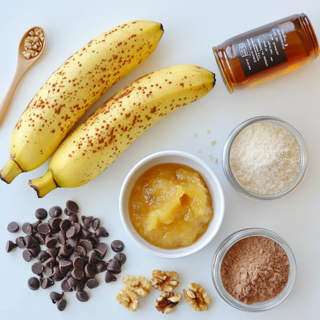 You need these simple ingredients to make chewy chocolate chip banana bars. Start with two ripe bananas. The riper, the better! Their sweetness adds flavor and moisture. Next, grab half a cup of unsweetened applesauce. This keeps the bars moist without extra fat.