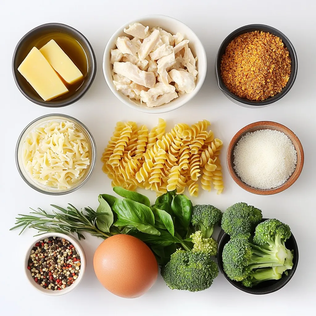 To make Chicken and Broccoli Alfredo Bake, gather these key ingredients: - 2 cups cooked rotini pasta - 1 pound boneless, skinless chicken breasts, diced - 2 cups fresh broccoli florets - 2 tablespoons extra virgin olive oil - 3 cloves garlic, minced - 2 cups Alfredo sauce - 1 cup shredded mozzarella cheese - 1/2 cup grated Parmesan cheese - Salt and black pepper to taste - 1 teaspoon Italian seasoning - 1/4 cup breadcrumbs (optional) You can add some extra flavor with these toppings: - Fresh chopped parsley or basil for garnish - Crushed red pepper flakes for heat - More grated cheese for a cheesier topping If you have specific dietary needs, try these swaps: - Use gluten-free pasta for a gluten-free option. - Swap chicken for diced tofu or shrimp for protein changes. - Make your own Alfredo sauce with dairy-free ingredients for a vegan dish. {{ingredient_image_2}} Start by preheating your oven to 350°F (175°C). This will help the dish cook evenly. Next, bring a large pot of salted water to a boil. Add 2 cups of fresh broccoli florets. Blanch them for 2-3 minutes until bright green. Drain and run them under cold water to stop the cooking. In the same pot, heat 2 tablespoons of olive oil over medium heat. Add 1 pound of diced chicken breasts. Cook for 6-8 minutes until the chicken is golden and cooked through. Stir in 3 cloves of minced garlic and cook for another minute. Season with salt, black pepper, and 1 teaspoon of Italian seasoning. This adds great flavor to the chicken. Now, stir in 2 cups of cooked rotini pasta and the blanched broccoli. Pour in 2 cups of Alfredo sauce and mix everything well. Grease a 9x13 inch baking dish and pour the mixture into it. Top with 1 cup of shredded mozzarella cheese and 1/2 cup of grated Parmesan cheese. If you want a crunchy topping, sprinkle 1/4 cup of breadcrumbs on top. Bake for 25-30 minutes until the cheese is bubbly and golden. Let it cool for a few minutes before serving. Enjoy your delicious Chicken and Broccoli Alfredo Bake! To make your Chicken and Broccoli Alfredo Bake creamy, focus on using a rich Alfredo sauce. You can use store-bought sauce, but homemade sauce adds a special touch. When mixing the sauce with pasta, ensure every piece gets coated well. This helps the sauce cling to the pasta and chicken. For added creaminess, stir in a splash of heavy cream or some cream cheese. Adding these ingredients brings a smooth, velvety texture that everyone will love. One common mistake is overcooking the broccoli. You want it to be tender-crisp, so blanch it for just 2-3 minutes. If you cook it too long, it turns mushy. Another mistake is not seasoning the chicken enough. Use salt, pepper, and Italian seasoning to bring out the flavors. Lastly, avoid overbaking. Keep an eye on the dish in the oven. Bake just until the cheese is bubbly and lightly golden. This keeps everything fresh and appealing. Choose fresh ingredients for the best taste. Use fresh broccoli florets instead of frozen ones. Fresh chicken breast should be boneless and skinless for easy cooking. For cheese, opt for high-quality mozzarella and Parmesan. These cheeses melt beautifully and enhance the flavor. If you want extra crunch, use fresh breadcrumbs instead of store-bought. They add texture and flavor to the top of the bake. Always taste as you go to ensure a balanced dish. Pro Tips Perfectly Cooked Chicken: Ensure that the chicken is cooked through but still juicy by using a meat thermometer. The internal temperature should reach 165°F (75°C) for safe consumption. Homemade Alfredo Sauce: For a richer flavor, consider making your own Alfredo sauce using butter, cream, and Parmesan cheese. This will elevate your bake to a gourmet level! Broccoli Texture: Blanch the broccoli just until bright green and tender-crisp. This will help maintain its vibrant color and crispness in the final bake. Cheese Variations: Experiment with different types of cheese such as gouda or cheddar for a unique twist on the flavor profile of your cheesy bake. {{image_4}} You can change the protein in this dish. Shrimp adds a nice twist. Just cook it until pink and tender. Tofu is a great option for a plant-based meal. Use firm tofu and sauté it until golden. Both choices work well with the creamy sauce. Feel free to swap out broccoli for other veggies. Spinach cooks down nicely and adds color. Bell peppers bring a sweet crunch. You can even mix in peas or carrots for added texture. The key is to keep the veggies fresh and vibrant. You can make your own Alfredo sauce for more flavor. Just blend cream, butter, and cheese. Add garlic for depth and a pinch of nutmeg for warmth. This will give your dish a unique touch. You can also try a lighter version with Greek yogurt. It’s a tasty way to cut calories without losing creaminess. To keep your Chicken and Broccoli Alfredo Bake fresh, store it in an airtight container. You can keep it in the fridge for up to three days. Make sure to let it cool down before sealing it. This way, it stays tasty and safe to eat later. When it’s time to enjoy leftovers, preheat your oven to 350°F (175°C). Place the pasta bake in a baking dish. Cover it with foil to keep it moist. Heat for about 20 minutes or until it’s warmed through. You can also use the microwave for a quicker option. Just heat it in short bursts, stirring in between. If you want to freeze your Chicken and Broccoli Alfredo Bake, do so before baking for the best texture. Wrap it tightly in plastic wrap and then in aluminum foil. It can last in the freezer for up to three months. To thaw, move it to the fridge overnight. Bake it straight from the fridge, adding a few extra minutes to the cooking time. Yes, you can prepare this dish ahead. Cook the chicken, broccoli, and pasta. Mix these with the Alfredo sauce. Then, store everything in a baking dish. Cover it well and keep it in the fridge. When you're ready to eat, bake it straight from the fridge. Just add a few extra minutes to the baking tim