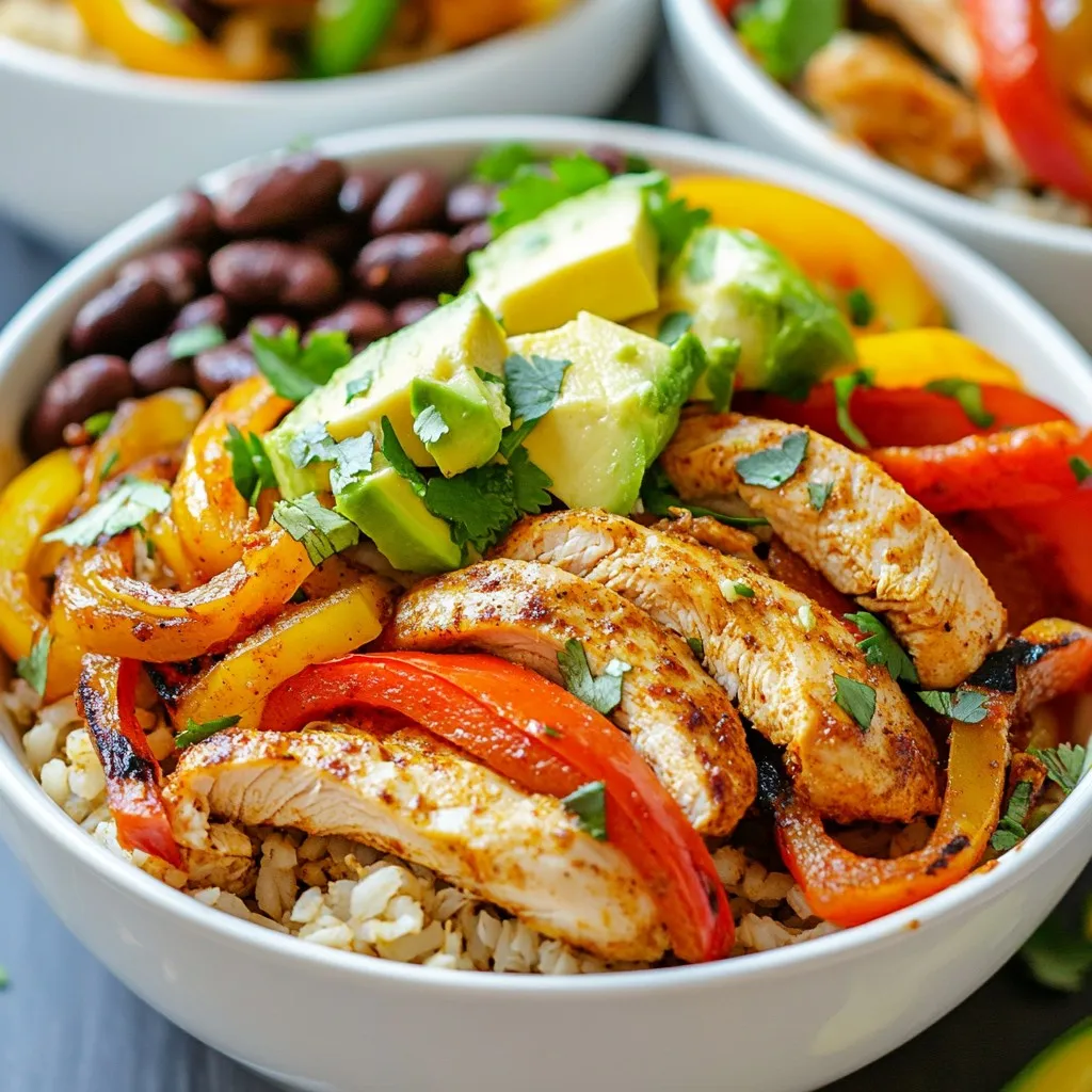 To make these Chicken Fajita Meal Prep Bowls, you need: - 2 chicken breasts, sliced into strips - 1 red bell pepper, sliced - 1 green bell pepper, sliced - 1 yellow onion, sliced - 3 tablespoons olive oil - 2 teaspoons chili powder - 1 teaspoon cumin - 1 teaspoon smoked paprika - 1 teaspoon garlic powder - 1 tablespoon lime juice - Salt and pepper to taste - 2 cups cooked brown rice or quinoa - 1 cup black beans, drained and rinsed - 1 avocado, diced (for topping) - Fresh cilantro (for garnish) I love using fresh ingredients. They make the dish burst with flavor. The spices are key for that zesty kick. You can add fun toppings to make your meal special. Here are some ideas: - Lime wedges for a fresh squeeze - Sliced jalapeños for heat - Sour cream for creaminess - Shredded cheese for extra flavor Feel free to mix and match. These toppings can change the meal completely! You can easily swap ingredients based on what you have. Here are some options: - Use turkey or tofu instead of chicken for different proteins. - Swap brown rice with cauliflower rice for a low-carb choice. - If you don’t have black beans, use pinto beans or corn. These substitutes help keep the meal fun and exciting. Don’t be afraid to get creative! {{ingredient_image_1}} Start by cutting the chicken breasts into strips. Place them in a large bowl. Add 2 tablespoons of olive oil, chili powder, cumin, smoked paprika, garlic powder, lime juice, salt, and pepper. Mix everything well. Make sure each piece of chicken gets coated with the marinade. Let it sit for about 10 minutes. This helps the chicken soak up all the flavors. Heat a large skillet on medium-high. Once it’s hot, add the marinated chicken. Cook for 6-8 minutes. Stir occasionally to avoid sticking. Cook until the chicken reaches 165°F (75°C). This ensures it’s safe to eat. Once cooked, remove the chicken from the skillet and place it on a plate. In the same skillet, add 1 tablespoon of olive oil. Then, toss in the sliced bell peppers and onions. Sauté these for about 5-7 minutes. You want them to be tender but still crisp. Season them with salt and pepper to taste. This adds extra flavor to the dish. It’s a simple step but makes a big difference. To save time, prep your ingredients ahead. Slice the chicken and veggies the night before. Store them in airtight containers in the fridge. This way, they are ready to go when you need them. Cook your grains in bulk. You can make enough brown rice or quinoa for several meals. Divide the cooked grains into portions. This cuts down on cooking time throughout the week. Use fresh spices for the best taste. Toasting chili powder and cumin in the skillet adds depth. Marinate your chicken for at least 30 minutes. This helps the flavors soak in. Don't skip the lime juice; it brightens the entire dish. You can also add a pinch of cayenne pepper for heat. A dash of hot sauce can give it an extra kick. Make each bowl look appealing. Layer the ingredients for a colorful display. Start with the grains at the bottom. Then, add the fajita chicken, followed by the sautéed veggies. Top with diced avocado and cilantro. For a fun touch, add lime wedges on the side. This not only looks good but adds a fresh burst of flavor when served. Pro Tips Marinating Matters: Allow the chicken to marinate for at least 30 minutes for a deeper flavor. If you have more time, refrigerate it overnight for maximum taste. Vegetable Crunch: To keep the bell peppers and onions crisp, avoid overcooking them. They should be tender yet still have a slight crunch when served. Customize Your Beans: Feel free to mix different beans like pinto or kidney beans for added variety and flavor in your meal prep bowls. Toppings Galore: Experiment with different toppings such as sliced jalapeños, sour cream, or cheese to elevate the flavor profile of your fajita bowls. {{image_2}} You can switch out chicken for other proteins. Try shrimp, beef, or turkey. Each protein brings its own flavor. For shrimp, cook it quickly to keep it tender. Beef needs a bit longer. Turkey works well if you want a lighter option. Use the same marinade for each protein to keep it simple. If you prefer a plant-based meal, go for tofu or tempeh. Both soak up the marinade well. Sauté them just like you would with chicken. You can also add more beans, like pinto or kidney, for extra protein. Don’t forget to add extra veggies, like zucchini or mushrooms, to boost flavor and nutrition. While brown rice and quinoa are great bases, you have other choices. Try couscous, farro, or even cauliflower rice. Each grain adds its own texture. Couscous cooks fast and is fluffy. Farro has a nice chewiness, while cauliflower rice is low-carb and light. Experiment to find your favorite! To keep your Chicken Fajita Meal Prep Bowls fresh, store them in the fridge. Make sure to let the bowls cool down before sealing them. This helps avoid condensation. Use airtight containers to keep the flavors locked in. If you plan to eat them within four days, they will stay tasty. When you are ready to eat, reheat your meal prep bowl. Use a microwave for quick reheating. Heat for about 2-3 minutes on medium power. Stir halfway through to ensure even warming. If you want to use the oven, preheat it to 350°F (175°C). Cover the bowl with foil and heat for 10-15 minutes. This keeps the chicken and veggies juicy. Choose glass or BPA-free plastic containers. Glass containers are great for reheating. They are safe and sturdy. Look for containers with separate sections. This helps keep your chicken, veggies, and grains apart. This way, you can enjoy each component fresh and flavorful. Chicken Fajita Meal Prep Bowls can last in the fridge for up to four days. Make sure to store them in airtight containers. This keeps the flavors fresh and helps prevent spoilage. Yes, you can freeze Chicken Fajita Meal Prep Bowls. They will stay good for about three months in the freezer. To freeze, separate the chicken, rice, and veggies 