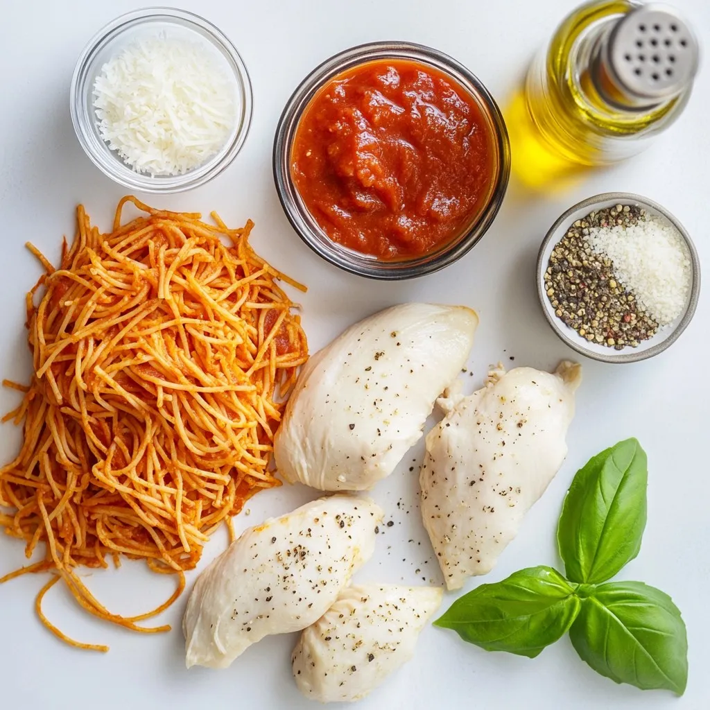 Gather these simple ingredients to make Chicken Parmesan Protein Pasta. You start with chicken breasts, which add great protein. Whole wheat or high-protein pasta offers more nutrients and fiber than regular pasta. Marinara sauce gives it a classic taste. The mozzarella and Parmesan cheese add that delicious cheesy flavor. Olive oil keeps everything moist and adds richness.