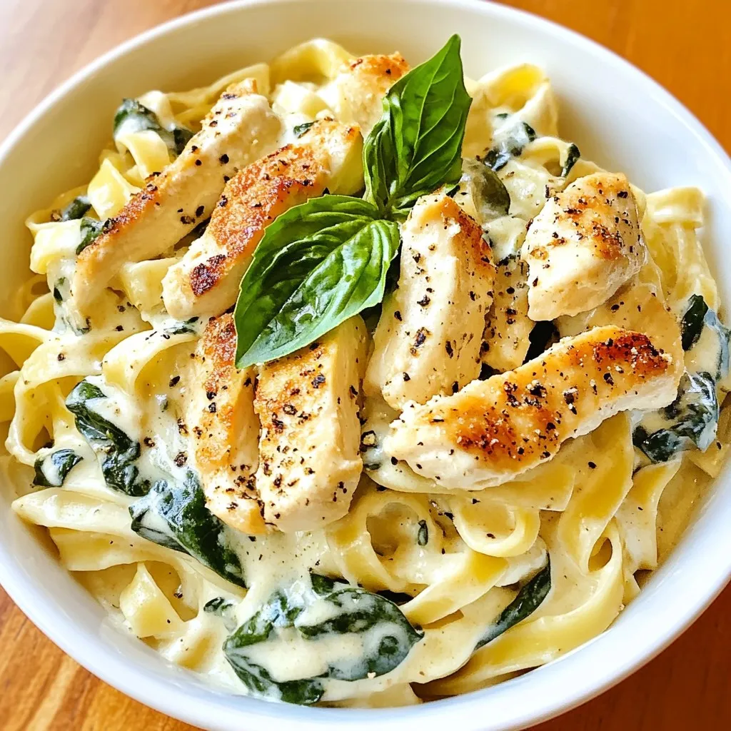 Fettuccine pasta is the star of this dish. It holds the creamy sauce well. I slice the chicken breasts into strips for quick cooking. The fresh spinach adds a vibrant color and healthy touch.