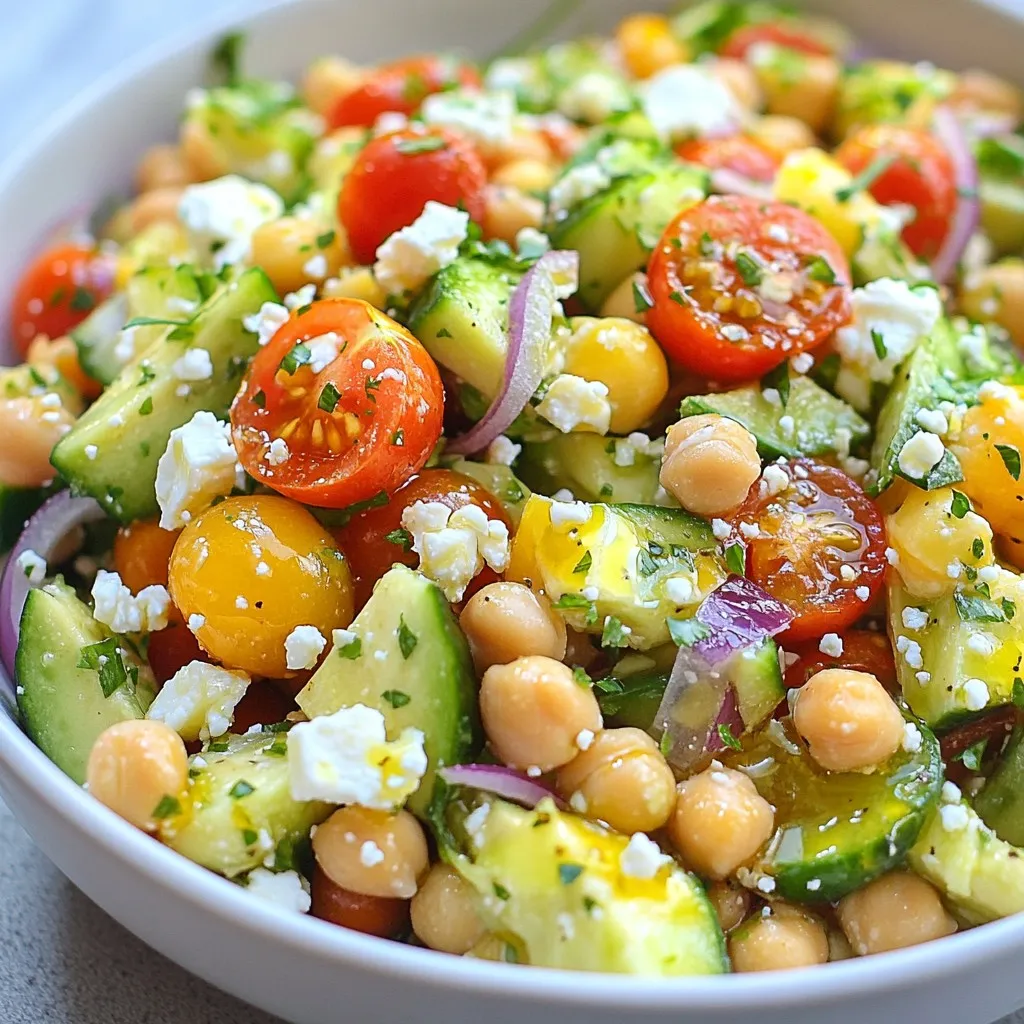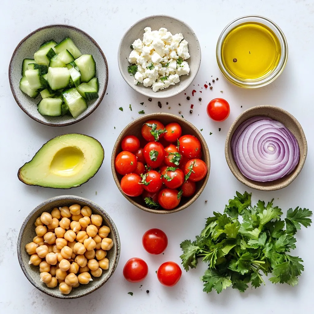 A refreshing salad combining chickpeas, avocado, feta cheese, and fresh vegetables, perfect for a light meal.