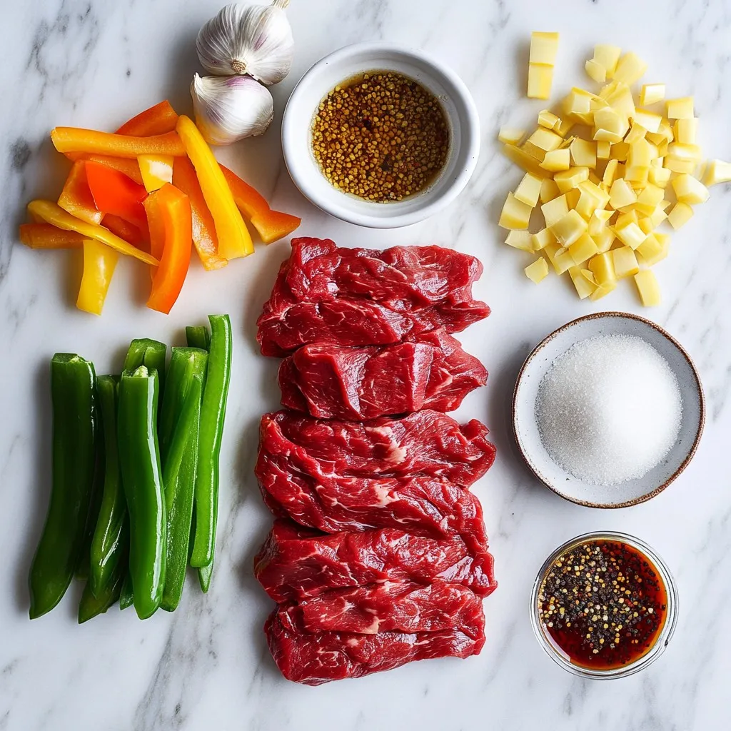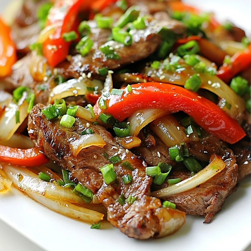 - 1 pound flank steak, thinly sliced against the grain - 2 tablespoons soy sauce - 2 tablespoons cornstarch - 2 tablespoons vegetable oil - 1 bell pepper (red, green, or yellow), sliced - 1 medium onion, sliced - 3 cloves garlic, minced - 1-inch piece ginger, minced - 1 tablespoon oyster sauce - 1 tablespoon sugar - ¼ teaspoon black pepper - ¼ cup beef broth - Chopped green onions for garnish When making Chinese pepper steak and onions, the right ingredients make all the difference. Start with flank steak, which is tender and flavorful. Slice it thinly; this helps it cook fast. Marinate the steak with soy sauce and cornstarch. This mix adds flavor and gives the meat a nice texture. You'll need fresh vegetables too. Pick a bell pepper—red, green, or yellow—along with a medium onion. These add color and crunch. Garlic and ginger are a must for that authentic taste. They pack a punch of flavor that wakes up the dish. Don't forget the sauces! Oyster sauce adds depth, while a bit of sugar balances the flavors. Black pepper gives it a kick, and beef broth keeps everything moist. Finally, top it off with chopped green onions for a fresh finish. With these ingredients, you're all set for a delicious meal! {{ingredient_image_1}} - First, grab a bowl. Combine sliced flank steak with soy sauce and cornstarch. - Mix well, then set aside to marinate for 15 minutes. This helps add flavor and tenderness. - While the steak marinates, slice the bell pepper and onion. - Mince the garlic and ginger. Set these aside for later. - Heat vegetable oil in a skillet over medium-high heat until hot. - Add the marinated steak to the skillet in one layer. Sear for 2-3 minutes. - After that, stir for 1 minute, then remove the steak from the skillet. - In the same skillet, add the sliced onion, bell pepper, garlic, and ginger. - Cook for 2-3 minutes until the vegetables are tender but still crisp. - In a small bowl, mix oyster sauce, sugar, black pepper, and beef broth. - Pour this sauce over the steak and vegetables. Toss well to coat everything. - Remove the skillet from heat. Garnish your dish with chopped green onions. When choosing flank steak, look for cuts with good marbling. Marbling means fat goes through the meat. Fat keeps the steak juicy and tasty. Freshness is key too. Check for bright red color and no strange smells. This assures you get tender meat. Cooking at medium-high heat is crucial. This heat helps form a nice crust on the steak. If your skillet is too cold, the steak will steam instead of sear. Always preheat your skillet before adding the meat. To achieve the perfect sear, add the steak in a single layer. Let it cook without stirring for 2-3 minutes. This allows a deep brown crust to form. After that, stir-fry for an extra minute to finish cooking. You can enhance flavor with simple seasonings. A splash of sesame oil adds a nutty taste. Try adding some crushed red pepper for heat. You can also mix in a dash of five-spice powder for depth. If you like it sweeter, add a bit more sugar. Each of these choices will elevate your dish. Pro Tips Use a Hot Skillet: Make sure your skillet or wok is very hot before adding the steak. This helps to sear the meat quickly, locking in the juices and creating a great crust. Cut Against the Grain: Always slice your flank steak against the grain. This will make your meat more tender and easier to chew. Don’t Overcook the Vegetables: Stir-fry the vegetables until they are just tender but still crisp. This will ensure they maintain their vibrant color and nutrients. Customize Your Heat: Adjust the number of bell peppers or add some chili flakes if you prefer a spicier dish. Tailor the recipe to your taste! {{image_2}} You can switch up the veggies in this dish. Try adding snap peas for a nice crunch. Carrots also add color and sweetness. Both choices will make your meal more colorful and fun. You can also mix in broccoli or zucchini for even more flavor. Use your favorite vegetables to keep things fresh. If you want to change the protein, chicken works great too. Just slice the chicken thinly and follow the same steps. Shrimp is another tasty option. It cooks fast and adds a nice touch. For a plant-based choice, use tofu. Make sure to press it first to remove extra water. These options let you enjoy the dish in many ways. Besides oyster sauce, you can try other sauces for new tastes. Teriyaki sauce will add a sweet and savory kick. Hoisin sauce brings a rich, thick flavor that pairs well with meat. You can also mix soy sauce with chili paste for some heat. Experimenting with sauces makes your dish unique each time. To store leftovers in the fridge, let the dish cool first. Place it in an airtight container. You can keep it fresh for up to three days. Make sure to label the container with the date so you know when to eat it. When you're ready to enjoy it again, just reheat it. If you want to freeze Chinese Pepper Steak & Onions, use a freezer-safe container. Let the dish cool completely before you freeze it. It can last for about three months in the freezer. To reheat, thaw it overnight in the fridge. Then, heat it in a skillet over medium heat until warmed through. For optimal freshness, use glass or BPA-free plastic containers. These materials help keep the food safe and tasty. Make sure the containers have tight-fitting lids to prevent air from getting in. This way, your flavors stay vibrant, and your meal remains enjoyable. Marinate the steak for about 15 minutes. This time allows the soy sauce and cornstarch to soak in. It helps to tenderize the meat and adds great flavor. If you have more time, you can let it marinate for up to 30 minutes. Just don’t go overboard, or it might become too salty. Yes, you can use other cuts of beef. Try sirloin or ribeye as good options. Both cuts are tender and work well in stir-fries. Just remember to slice them thin against the grain for the best texture. If you want a leaner choice, you can also use eye of round. Thi