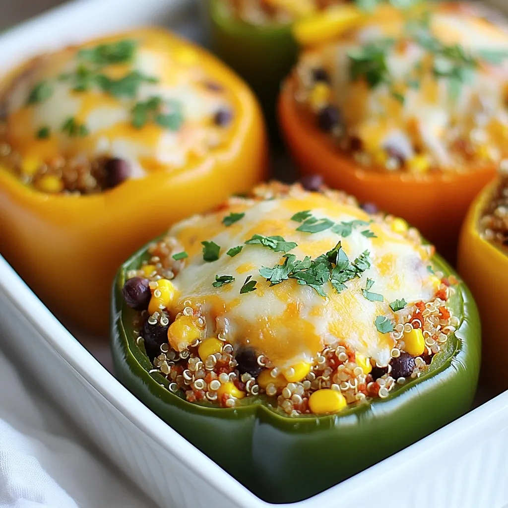 Here’s what you need to make classic stuffed peppers. Gather these fresh and wholesome items: - 4 large bell peppers (any color) - 1 cup quinoa, rinsed - 2 cups vegetable broth - 1 can (15 oz) black beans, drained and rinsed - 1 cup corn (fresh, frozen, or canned) - 1 medium onion, diced - 2 cloves garlic, minced - 1 teaspoon cumin - 1 teaspoon smoked paprika - 1 teaspoon chili powder - Salt and pepper to taste - 1 cup shredded cheese (cheddar or Monterey Jack) - Fresh cilantro or parsley for garnish These ingredients combine to create a tasty, filling meal. You can mix and match some items based on your taste. For example, if you like spice, add more chili powder or hot sauce. If you prefer a milder flavor, reduce the spices. The fresh herbs at the end add a bright touch. Enjoy customizing your stuffed peppers! {{ingredient_image_1}} 1. Preheat your oven to 375°F (190°C). This step is key for even cooking. 2. Grab the bell peppers and cut off their tops. Remove seeds and membranes. Place them upside down in a baking dish. This helps them stay upright. 3. In a medium pot, combine the rinsed quinoa and vegetable broth. Bring it to a boil. Then lower the heat, cover, and let it simmer for about 15 minutes. The quinoa should be fluffy when done. 1. Heat a drizzle of olive oil in a large skillet over medium heat. Add the diced onion and sauté for 3-4 minutes. You want them to become soft and clear. 2. Next, add the minced garlic, cumin, smoked paprika, chili powder, salt, and pepper. Cook this mix for an extra minute. This step gives your dish great flavor. 3. Stir in the black beans and corn. Mix well to combine everything. This adds texture and color to your filling. 4. When the quinoa is ready, add it to the skillet. Stir everything together until well mixed. Remove the skillet from heat. 1. Pour a small amount of water into the bottom of the baking dish. Just cover the bottom. This creates steam while baking. 2. Cover the dish tightly with aluminum foil. Bake for 25 minutes. This helps the peppers cook evenly. 3. After 25 minutes, take off the foil and bake for another 10 minutes. This melts the cheese and makes it bubbly. 4. Once done, let the stuffed peppers cool for a few minutes. Garnish them with fresh cilantro or parsley before serving. - Ensuring quinoa is cooked properly: Always rinse quinoa before cooking. This helps to remove its bitter coating. Cook it in vegetable broth for better flavor. Bring it to a boil, then lower the heat and cover. Let it simmer for about 15 minutes. When it’s fluffy, it’s ready. - Best cheese recommendations: I love using sharp cheddar or Monterey Jack cheese. Both melt well and add rich flavor. If you want a kick, try pepper jack. It brings a nice spice to the dish. - Tips for sautéing vegetables: Use medium heat for sautéing. Start with onions, as they take longer to cook. Add garlic just before the onions finish. This keeps the garlic from burning. You want the onions to be soft and sweet. - Serving suggestions on a platter: Place the stuffed peppers on a bright platter. This makes them look festive and inviting. You can arrange them in a circle or line for a fun display. - Drizzling oils and garnishing techniques: Drizzle some extra virgin olive oil on top for shine. Sprinkle chopped cilantro or parsley for color and freshness. This makes your meal look as good as it tastes. - Suggested spices to elevate flavor: Besides cumin and paprika, consider adding oregano or onion powder. These spices deepen the flavor. A hint of cinnamon can also add warmth. - Adding hot sauce or salsa: For spice lovers, drizzle hot sauce over your peppers. You can also serve them with salsa on the side. This adds a fresh kick and a burst of flavor with every bite. Pro Tips Choose Colorful Peppers: Using a mix of red, yellow, and green bell peppers not only adds visual appeal but also a variety of flavors to your dish. Customize the Filling: Feel free to add other vegetables or proteins like ground turkey or mushrooms to the quinoa filling for a personalized touch. Steam for Moisture: Adding water to the bottom of the baking dish creates steam, preventing the peppers from drying out during baking. Serve with a Sauce: A drizzle of avocado crema or your favorite salsa can elevate the flavors and add a creamy texture to the dish. {{image_2}} You can easily change the ingredients in stuffed peppers. If you want to switch from quinoa to rice, use 1 cup of cooked rice instead. Both grains taste great and are filling. You can also swap out the black beans for other beans like kidney or pinto beans. If you want more protein, try ground turkey or chicken. They add a nice flavor boost. For cheese lovers, shredded cheese is a must. If you're dairy-free, use dairy-free cheese. Brands like Daiya or Violife work well and melt nicely. Stuffed peppers are easy to adapt for different diets. For vegetarians or vegans, stick to the quinoa, beans, and veggies. Just skip the cheese or use a vegan kind. If you need gluten-free options, you're in luck! All the main ingredients are gluten-free. Just ensure any broth or cheese you use is labeled gluten-free. A Mediterranean twist on stuffed peppers can add exciting flavors. Use ingredients like feta cheese, olives, and fresh herbs like oregano or basil. This mix will give your dish a fresh, bright taste. For a Southwestern style, add spices like cumin, chili powder, and even some diced jalapeños. You can also include corn, black beans, and a sprinkle of lime juice for a zesty kick. Each variation makes for a fun meal full of flavor! To store leftover stuffed peppers, let them cool first. Place them in a sealed container. This helps keep them fresh. They can last in the fridge for up to four days. Make sure to check for any signs of spoilage before eating. You can freeze stuffed peppers before or after baking. If you freeze them before baking, wrap each pepper tightly in plastic wrap. Place them in a freezer bag. They can last for up to