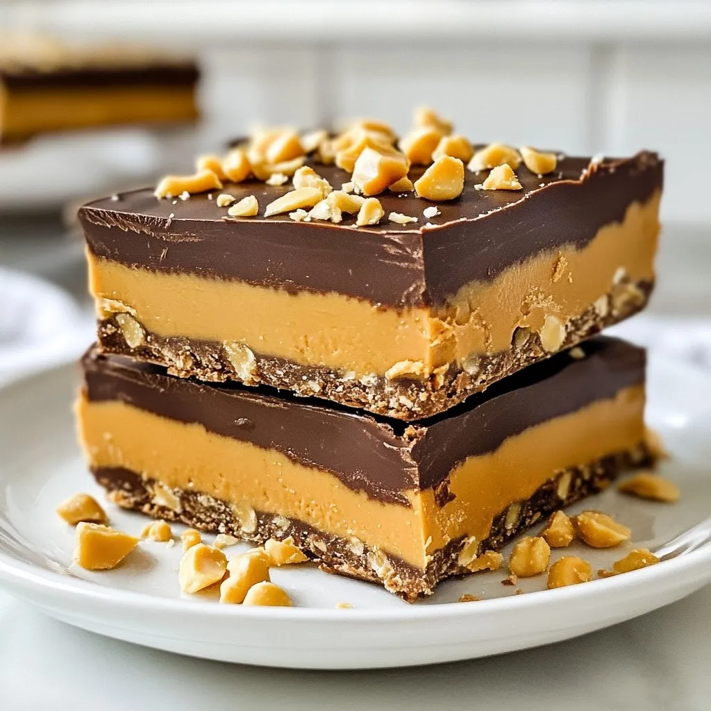 The finished Copycat Reese’s Protein Peanut Butter Bars look amazing. They have a rich, dark chocolate top with a sprinkle of crushed peanuts. The layers are thick but neat, creating a perfect bite size. You can see the creamy peanut butter peeking through, making them look very appetizing. Each square is set just right, showing off that yummy texture. When you serve them, stack a few with a drizzle of melted chocolate. This adds a nice touch and makes them even more tempting.