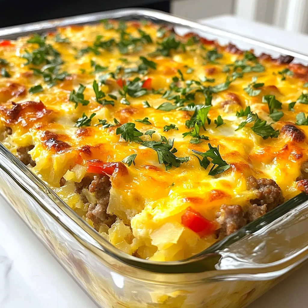 A delicious breakfast casserole featuring eggs, sausage, cheese, and vegetables, perfect for a hearty morning meal.