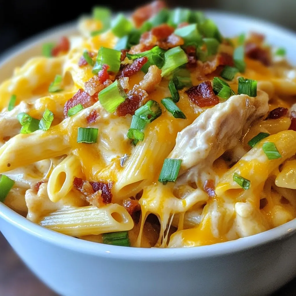 - 1 pound penne pasta - 2 cups cooked, shredded chicken - 8 ounces cream cheese For this dish, you need penne pasta, shredded chicken, and cream cheese. The penne gives a nice bite, while the chicken adds protein. Cream cheese makes the sauce creamy and rich. I often use rotisserie chicken for ease. It saves time and adds great flavor. - 1 cup ranch dressing - 1 cup sharp cheddar cheese, shredded - ½ cup mozzarella cheese, shredded - 1 cup cooked bacon bits - 1 teaspoon garlic powder - 1 teaspoon onion powder - ½ teaspoon black pepper Ranch dressing brings a tangy kick to the dish. Cheddar and mozzarella add depth and creaminess. Bacon bits add a smoky crunch. Garlic and onion powder enhance the flavor. Black pepper gives it a slight heat. Each of these ingredients works together to create a rich and tasty meal. - ¼ cup green onions, chopped - Salt to taste Green onions add a fresh touch. They brighten the dish and make it look nice. Salt helps balance all the flavors. Adjust it to your taste, but be careful not to overdo it. Each ingredient plays a role in making Crack Chicken Penne a true delight. {{ingredient_image_1}} To start, bring a large pot of salted water to a boil. This step is key for flavor. Once boiling, add 1 pound of penne pasta. Cook it according to the package instructions until it's al dente. You want it firm but not hard. This usually takes about 10 to 12 minutes. After cooking, drain the pasta in a colander. Make sure to shake off any excess water. Set the pasta aside while you prepare the sauce. Now, let’s make the creamy sauce. In a large mixing bowl, combine 8 ounces of softened cream cheese and 1 cup of ranch dressing. This combo gives a great flavor. Next, add 1 teaspoon each of garlic powder and onion powder. Also, add ½ teaspoon of black pepper. Mix these ingredients well until the sauce is smooth and creamy. You want it to be easy to stir. This will coat the pasta and chicken beautifully. Next, it’s time to bring everything together. Add 2 cups of shredded chicken and 1 cup of cooked bacon bits to the bowl. For cheese lovers, add 1 cup of shredded sharp cheddar and ½ cup of shredded mozzarella. Stir until everything is well-coated with the creamy sauce. Now, gently fold the cooked penne pasta into the chicken mixture. If the mixture feels thick, add a splash of the pasta cooking water. This helps loosen it up. If you enjoy baked dishes, you can take it a step further. Transfer the mixture to a greased baking dish. Sprinkle more cheddar cheese on top. Bake it in a preheated oven at 350°F for about 20 minutes. Look for a bubbly, golden top. After baking, let it cool slightly. Garnish with chopped green onions for a fresh touch before serving. Enjoy your Crack Chicken Penne! Using rotisserie chicken saves time. You can find it at any grocery store. Just shred it up and mix it in. This adds flavor and cuts prep time. To adjust creaminess, use pasta water. After boiling penne, save some water. If your mix feels thick, add a splash. This keeps your dish smooth and tasty. You can add vegetables to boost nutrition. Try spinach, bell peppers, or broccoli. Chop them small so they mix well. You can even toss in frozen peas for ease. For heat, think about spices. Add red pepper flakes or diced jalapeños. Start with a small amount, then taste. You can always add more if you want it spicier. For baking, set your oven to 350°F (175°C). Bake your dish for about 20 minutes. Look for a bubbly and golden top as a sign it’s ready. Using foil can help create a perfect crust. Cover your dish for the first 15 minutes. This keeps moisture in, then uncover to let it brown. Pro Tips Use Leftover Chicken: For a quicker meal, utilize leftover rotisserie chicken or any pre-cooked chicken to save time on preparation. Adjust the Creaminess: If you prefer a creamier dish, feel free to add more cream cheese or a splash of heavy cream to your sauce. Customize Your Cheeses: Experiment with different cheese combinations like pepper jack for a spicy kick or gouda for a smoky flavor. Add Veggies: Incorporate veggies such as spinach, broccoli, or bell peppers to enhance the nutritional value and add color to your dish. {{image_2}} You can easily adapt Crack Chicken Penne for different diets. For a low-carb option, swap the penne pasta for zucchini noodles. This keeps the dish light and fresh. Simply spiralize the zucchini and sauté it for a few minutes before adding it to the sauce. If you need a gluten-free option, look for gluten-free penne. Many brands offer this choice, and it cooks just like regular pasta. Make sure to check the package for cooking times. Want to spice things up? Add jalapeños for a kick. You can mix in diced jalapeños when you combine everything. This adds heat and flavor that really pops. For an Italian twist, try adding sun-dried tomatoes. Chop them up and stir them into the sauce for a burst of flavor. They pair well with the creamy base and give a nice tang. You can make Crack Chicken Penne in different ways. For a quick meal, use an Instant Pot. Start by cooking the penne in the pot. Then, mix in the other ingredients. Seal the lid and cook on high for just a few minutes. If you prefer a slow cooker, this works great too. Cook the chicken and sauce in the slow cooker for four to six hours on low. Then, stir in the cooked penne before serving. This method lets the flavors meld beautifully. To store leftovers, place Crack Chicken Penne in an airtight container. This keeps it fresh. Make sure the dish cools before sealing. In the fridge, it lasts about 3 to 4 days. If you plan to eat it later, label the container with the date. This helps you track freshness. Freezing is a great option for longer storage. To freeze, transfer the penne to a freezer-safe container. You can also use freezer bags for easy storage. Divide into portions for quick meals. Crack Chicken Penne can last up to 3 months in the freezer. When ready to eat, thaw it in the fridge overnigh