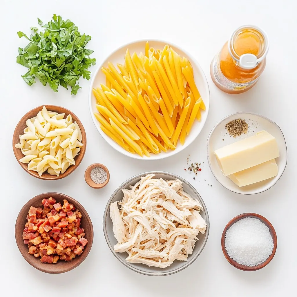 For this dish, you need penne pasta, shredded chicken, and cream cheese. The penne gives a nice bite, while the chicken adds protein. Cream cheese makes the sauce creamy and rich. I often use rotisserie chicken for ease. It saves time and adds great flavor.