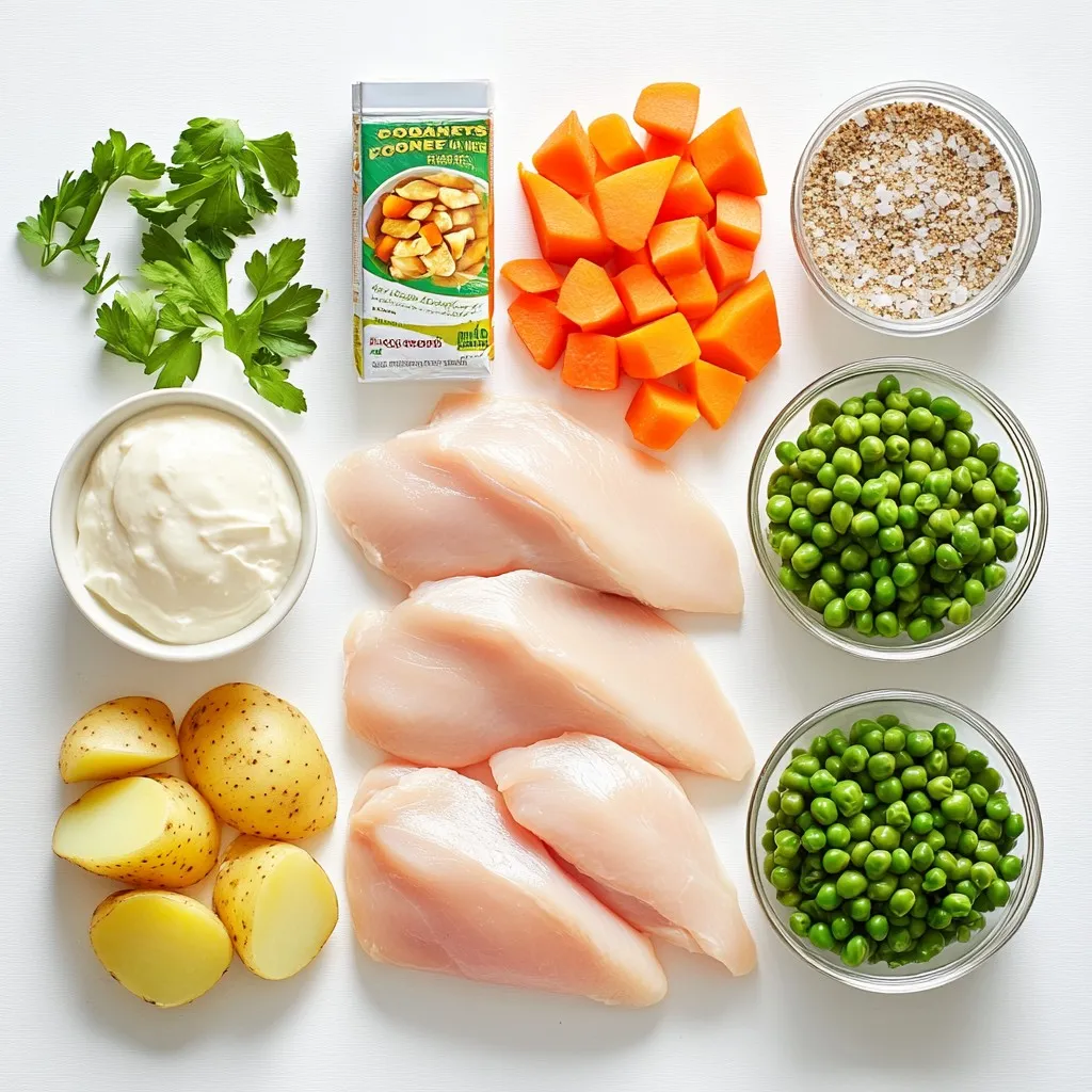 Next up is chicken broth. One cup of it will keep the chicken moist and rich. Diced potatoes are essential too. They add heartiness and soak up all the ranch flavor. Don’t forget one cup of frozen peas and carrots mix. This gives a nice color and nutrition boost.