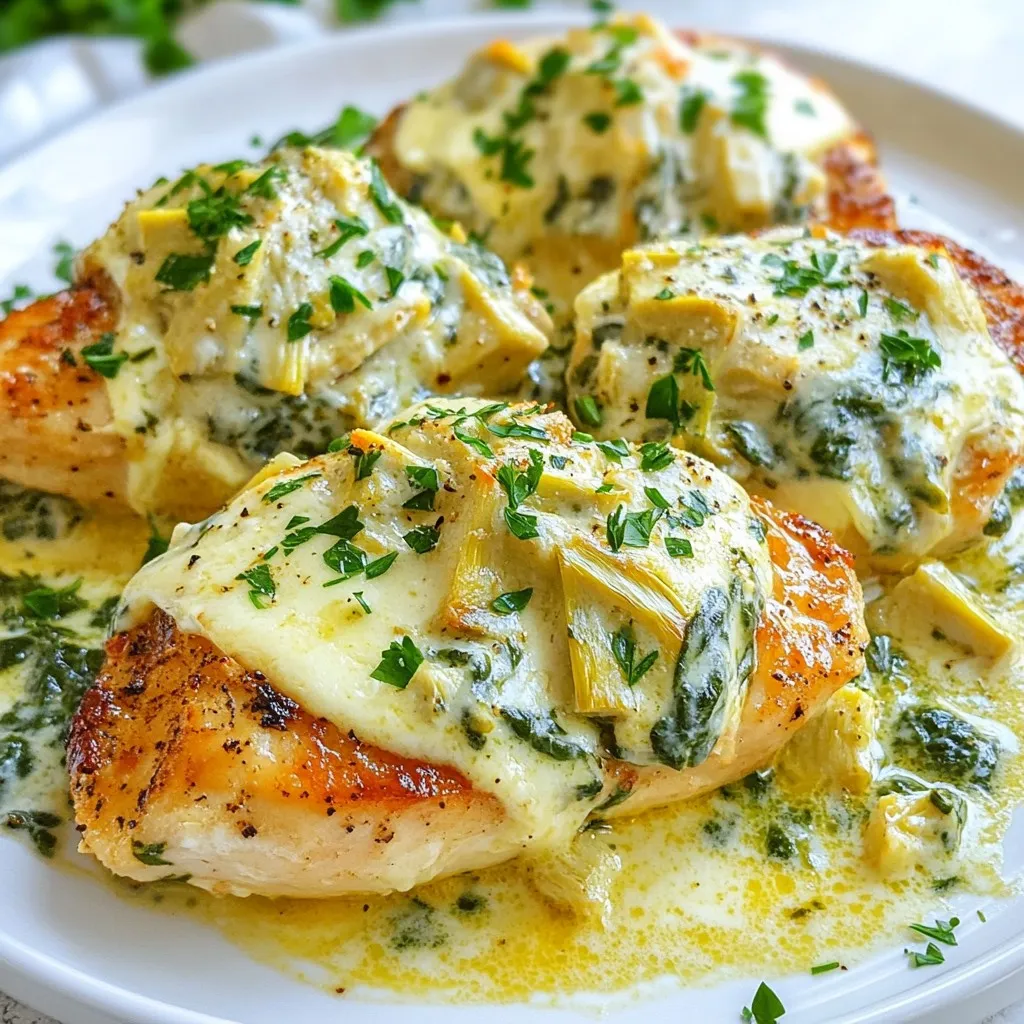 A delicious and creamy chicken dish featuring spinach and artichokes.