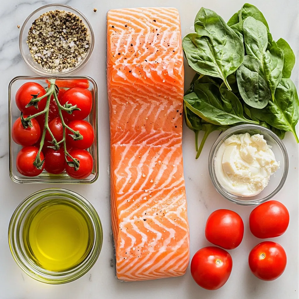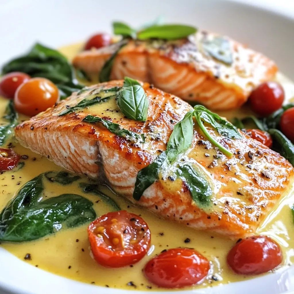 - 4 salmon fillets - 2 tablespoons olive oil - 3 cloves garlic, minced - 1 cup cherry tomatoes, halved - 1 cup spinach leaves - 1 cup heavy cream - 1/2 cup grated Parmesan cheese - 1 teaspoon dried Italian herbs (oregano, basil, thyme) - Salt and pepper to taste - Fresh basil leaves for garnish The ingredients in Creamy Tuscan Salmon are key to creating a rich and tasty dish. Salmon fillets are the star of this recipe. They offer a great source of protein and healthy fats. The olive oil helps cook the salmon while adding flavor. Garlic gives a wonderful aroma and taste. Cherry tomatoes add a burst of sweetness and color. Spinach leaves bring a nice green touch and are packed with nutrients. Heavy cream makes the sauce smooth and rich. Adding grated Parmesan cheese enhances the creaminess and adds depth to the flavor. The dried Italian herbs, like oregano and thyme, bring a fragrant touch. Salt and pepper make sure every bite is tasty. Finally, fresh basil leaves add a beautiful garnish and a fresh finish. This simple list of ingredients makes it easy to create a gourmet meal at home. You can find all these items at your local store. Enjoy gathering them! {{ingredient_image_1}} 1. Heat olive oil. Begin by pouring two tablespoons of olive oil into a large skillet. Turn the heat to medium. Wait until the oil gets hot. 2. Season and cook salmon fillets. Place four salmon fillets skin-side down into the skillet. Sprinkle salt and pepper on top. Cook the salmon for about four to five minutes on each side. Look for a golden brown color. Once done, take the salmon out and set it aside. 1. Sauté minced garlic. In the same skillet, add three cloves of minced garlic. Stir and cook for about thirty seconds. You should smell its lovely aroma. 2. Add cherry tomatoes and spinach. Now, toss in one cup of halved cherry tomatoes. Cook for about three to four minutes. The tomatoes will soften and burst a little. Next, add one cup of spinach leaves. Stir until the spinach wilts, which takes about two minutes. 3. Incorporate heavy cream and Parmesan cheese. Pour in one cup of heavy cream. Bring it to a gentle simmer. Lower the heat and mix in half a cup of grated Parmesan cheese. Also, add one teaspoon of dried Italian herbs. Stir until the cheese melts and the sauce is creamy. 1. Return salmon to skillet. Place the cooked salmon fillets back in the skillet. Spoon the creamy sauce over the salmon. 2. Simmer to blend flavors. Let everything simmer for another two to three minutes. This helps all the flavors mix well. 3. Adjust seasoning as needed. Taste the sauce and add more salt or pepper if you like. To cook salmon well, aim for a medium heat. Heat the olive oil in your skillet. Add the salmon fillets skin-side down. Cook each side for about 4-5 minutes. The salmon should turn golden brown. To check for doneness, look for the flesh to flake easily with a fork. You can also use a food thermometer. The inside should reach 145°F. To elevate the creamy sauce, try adding more flavor. A squeeze of lemon juice boosts taste. Fresh herbs like parsley or dill can also enhance it. If you want a lighter sauce, you can swap heavy cream. Use half-and-half or coconut cream instead. These options can make your dish unique. Presentation makes your meal shine. Garnish with fresh basil leaves for color. You can also add a sprinkle of grated Parmesan on top. Serve the creamy Tuscan salmon over a bed of pasta or rice. This adds a nice touch and makes the dish feel complete. Pro Tips Perfectly Cooked Salmon: To achieve perfectly cooked salmon, use a fish spatula to gently press down the fillet when it first hits the pan. This ensures even cooking and crisp skin. Fresh Herbs Matter: For the best flavor, use fresh basil instead of dried. Add it at the end of cooking to preserve its aromatic qualities. Adjusting Creaminess: If you'd like a lighter sauce, you can substitute half of the heavy cream with chicken or vegetable broth. This will still provide a rich flavor while reducing calories. Make it Your Own: Feel free to add other vegetables like bell peppers or zucchini to the sauce for added nutrition and flavor. Just sauté them along with the garlic. {{image_2}} You can change the fish in this dish. Try trout, tilapia, or even cod. Each fish brings its own flavor and texture. For a vegan twist, swap salmon for tofu or chickpeas. Use firm tofu to hold its shape in the sauce. This makes the dish hearty and satisfying. To boost taste, add lemon zest to the sauce. The zest brings a bright kick that balances the creaminess. You can also toss in capers or olives. These salty bites add depth and contrast. Just a few will elevate your dish. Pair this creamy salmon with a fresh green salad or roasted veggies. The crunch of vegetables balances the rich sauce. You can also serve it with pasta or rice. These sides soak up the flavors well. For drinks, a crisp white wine works best. Consider Sauvignon Blanc or Pinot Grigio. They complement the creaminess and enhance the meal. Enjoy making this dish your own! To store leftover creamy Tuscan salmon, let it cool first. This step helps prevent moisture buildup. After cooling, transfer the salmon and sauce into airtight containers. Glass or BPA-free plastic containers work well. Make sure to seal them tightly to keep the flavors fresh. When you're ready to enjoy your leftovers, use gentle heat. The best way to reheat creamy salmon is on the stovetop. Place the salmon in a skillet over low heat. Add a splash of cream to keep it moist. Stir occasionally until it warms through. This method helps maintain the creamy texture. Can you freeze creamy sauce? Yes, but it may change texture when thawed. To freeze, place the salmon in a freezer-safe container. Make sure to separate the sauce if you can. When ready to eat, thaw overnight in the fridge. Reheat gently on the stovetop, adding cream as needed. This will help revive that creamy goodness! You can use milk and butter as a lighter option. Mix 3/4