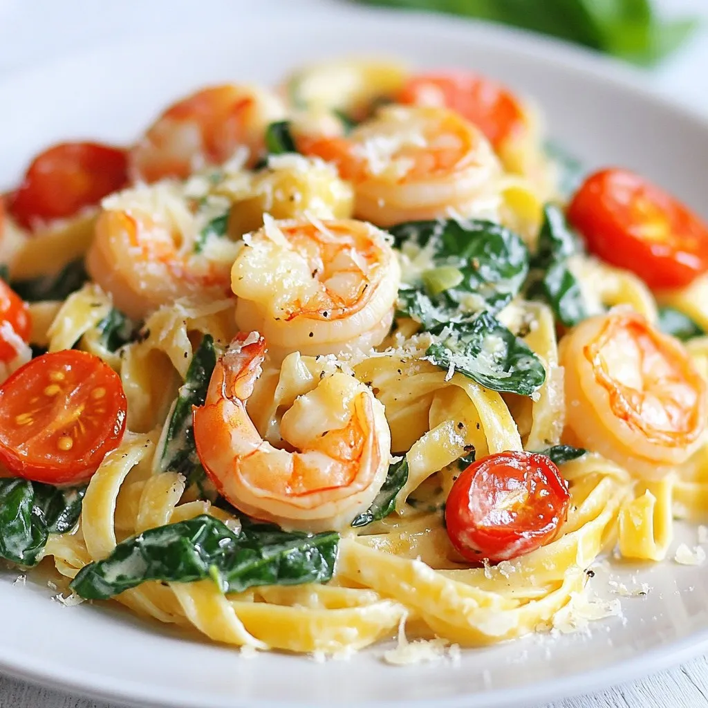 - 8 oz fettuccine or linguine - 1 lb shrimp, peeled and deveined - 2 tablespoons olive oil - 3 cloves garlic, minced - 1 cup cherry tomatoes, halved - 2 cups fresh spinach - 1 cup heavy cream - 1/2 cup grated Parmesan cheese - 1 teaspoon Italian seasoning You will love the main ingredients in this creamy Tuscan shrimp pasta. The shrimp adds a sweet taste and a nice bite. Fettuccine or linguine gives a lovely base for the sauce. Olive oil provides a rich flavor, while garlic adds warmth. Cherry tomatoes bring a juicy burst. Fresh spinach adds color and health. Heavy cream makes the dish creamy and rich. Parmesan gives a salty kick, and Italian seasoning ties it all together. - Salt - Pepper - Fresh basil Salt and pepper are essential for flavor. Use them to season shrimp and sauce. Fresh basil adds a lovely aroma and taste when you garnish your dish. These pantry staples elevate your meal. - Additional seasonings - Alternative pastas Feel free to add herbs like oregano or thyme for extra flavor. If you want, try different pasta shapes, like penne or spaghetti. Both choices can change the dish's texture and look. {{ingredient_image_1}} - Boiling Water and Cooking Time Start by filling a large pot with water. Add a pinch of salt to the water. Bring it to a rolling boil. Once boiling, add 8 oz of fettuccine or linguine. Cook according to the package instructions until the pasta is al dente. This usually takes about 8 to 10 minutes. - Draining and Setting Aside After cooking, carefully drain the pasta in a colander. Make sure to shake off any excess water. Set the pasta aside for later use in the dish. - Preparing the Skillet In a large skillet, add 2 tablespoons of olive oil. Heat the oil over medium heat. This oil will help cook the shrimp evenly. - Cooking Time and Indicators Add 1 lb of peeled and deveined shrimp to the hot oil. Season the shrimp with salt, pepper, and 1 teaspoon of Italian seasoning. Cook the shrimp for about 2-3 minutes on each side. They are done when they turn pink and opaque. Remove the shrimp and set them aside. - Sautéing Garlic and Cherry Tomatoes In the same skillet, add 3 cloves of minced garlic. Sauté for about 30 seconds until the garlic smells great. Next, add 1 cup of halved cherry tomatoes. Cook these for 2-3 minutes until they soften. - Adding Spinach and Cream Stir in 2 cups of fresh spinach. Cook it until it wilts. Then pour in 1 cup of heavy cream. Bring the mixture to a gentle simmer. Reduce the heat and add 1/2 cup of grated Parmesan cheese. Stir until the cheese melts and the sauce is creamy. - Mixing Pasta, Shrimp, and Sauce Add the drained pasta back into the skillet. Toss it gently with the shrimp and creamy sauce. This step ensures every bite is coated with that rich sauce. - Adjusting Seasoning Taste the dish and adjust the seasoning. Add more salt and pepper if you feel it needs it. - Plating and Garnishing Divide the creamy Tuscan shrimp pasta into serving plates. Garnish with fresh basil leaves for a nice touch. - Accompaniments This dish pairs well with a crisp green salad or garlic bread. Enjoy your flavorful dinner delight! Al Dente Tips To cook pasta just right, use a big pot and plenty of water. Add a pinches of salt to the boiling water. Cook the pasta for about 8 to 10 minutes. Check the package for exact times. Taste it a minute early. You want it firm but not hard, which is called al dente. This gives the best texture. Reheating Suggestions When reheating, add a splash of water or cream to keep it moist. Warm it in a skillet over low heat. Stir often to avoid sticking. You can also microwave it. Use a microwave-safe dish and cover it to keep moisture in. Fresh Herbs and Seasoning Ideas Fresh herbs pack a punch! Add chopped basil or parsley for bright flavor. A squeeze of lemon juice adds freshness too. If you want more spice, sprinkle in some red pepper flakes. They give a nice kick without being too hot. Cheese Variations While Parmesan is classic, you can mix things up. Try Pecorino Romano for a sharper taste. A bit of feta can add a nice saltiness. Mix different cheeses for a richer flavor. Just remember to adjust salt as needed. Meal Prep Strategies To save time, prep your shrimp and veggies ahead. You can clean and chop tomatoes and spinach the night before. Store them in the fridge. This way, when you cook, it all comes together fast. Using Frozen Shrimp Frozen shrimp is a great option! It’s often just as fresh. You can skip thawing by cooking it straight from the freezer. Just add a few extra minutes to the cooking time. This is perfect for quick meals. Pro Tips Use Fresh Shrimp: For the best flavor and texture, use fresh shrimp instead of frozen. If using frozen, ensure they are fully thawed and patted dry before cooking. Don’t Overcook the Pasta: Cook the pasta just until al dente, as it will continue to cook slightly when combined with the sauce. This helps prevent mushy pasta. Adjust the Creaminess: If you prefer a lighter sauce, you can substitute half of the heavy cream with chicken broth or vegetable broth for a delicious variation. Garnish Generously: Fresh basil not only adds a pop of color but also enhances the dish's flavor. Don’t skimp on this final touch! {{image_2}} Tomato-Based Variation You can swap the creamy sauce for a tomato-based one. Use crushed tomatoes instead of cream. This gives a fresh and tangy taste. Add herbs like basil and oregano for more flavor. Adding Vegetables You can mix in other veggies. Try zucchini, bell peppers, or mushrooms. Sauté them with the garlic for a tasty twist. This adds color and nutrition to your dish. Chicken or Tofu Substitutions If you want a change, use chicken or tofu. Cook diced chicken in the same way as shrimp. For tofu, use firm tofu, and sauté until golden. Both options make this dish hearty and satisfying. Seafood Mix Options You can also use a mix of seafood. Combine shrimp with scallops or mussels. This adds depth and variety to the dish. Just adjust t