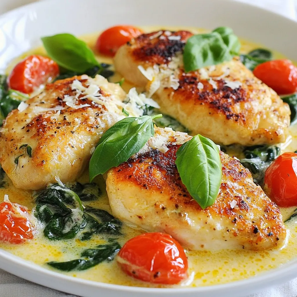 These ingredients work together to create a creamy sauce that coats the chicken perfectly. The chicken is juicy and tender, while the spinach and tomatoes add freshness. The Parmesan cheese makes it rich and satisfying. Using fresh basil as a garnish gives it a lovely aroma and flavor. You can find these items at most grocery stores. Make sure to use fresh spinach and ripe tomatoes for the best taste. Enjoy gathering these ingredients; they will bring your dish to life!