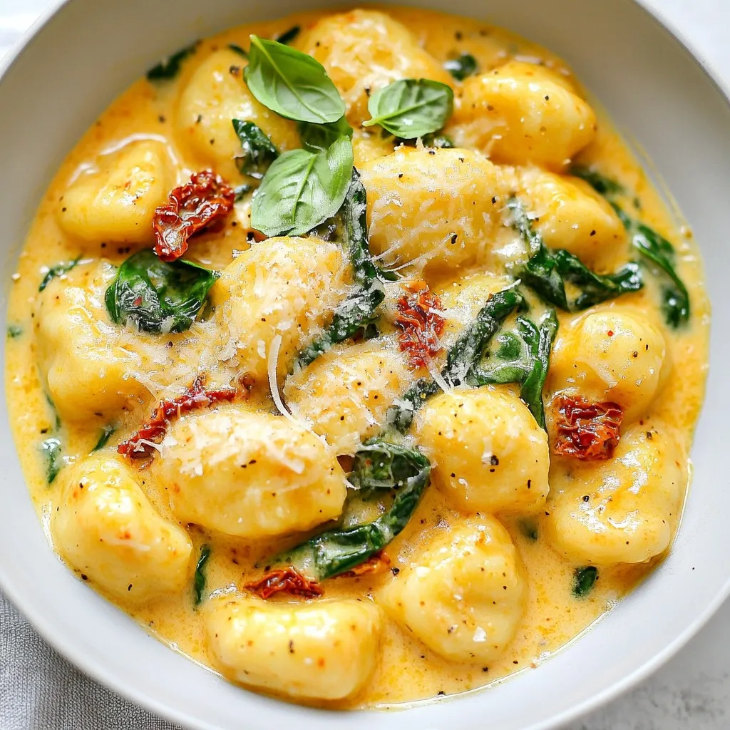 A rich and creamy gnocchi dish featuring sun-dried tomatoes and fresh spinach.