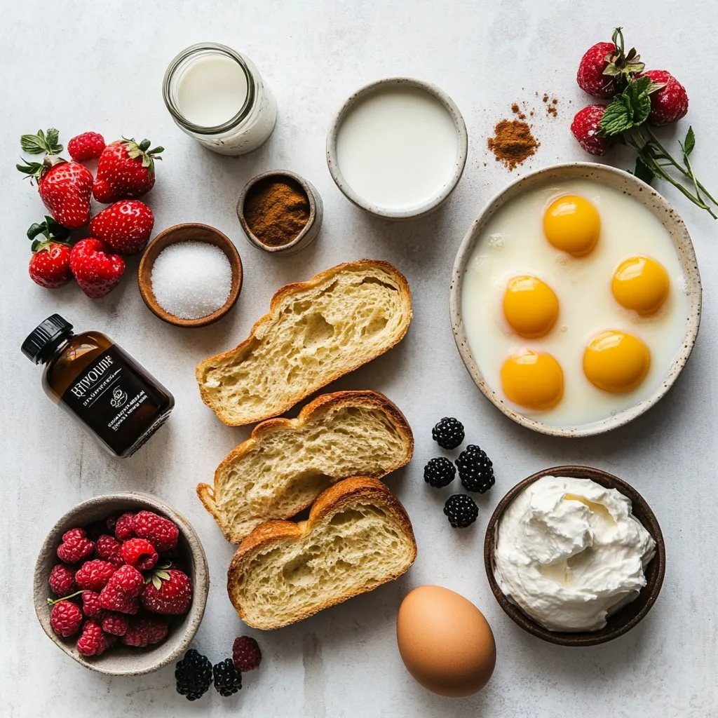 Each ingredient plays a role in creating a rich and creamy dish. The brioche or challah gives a soft texture. Eggs add richness and help bind the mixture. Whole milk and heavy cream create a smooth custard base. Flavoring extracts, like vanilla and almond, add depth. Sweeteners caramelize beautifully, forming that signature crunchy top. Fresh berries and whipped cream bring a nice touch to the plate.