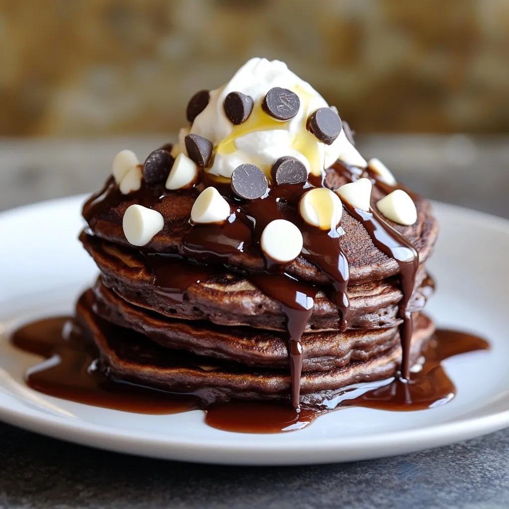 Stack the pancakes high on a plate, drizzle with chocolate syrup, and top with a dollop of whipped cream. Sprinkle additional chocolate chips on top for a luxurious finish!
