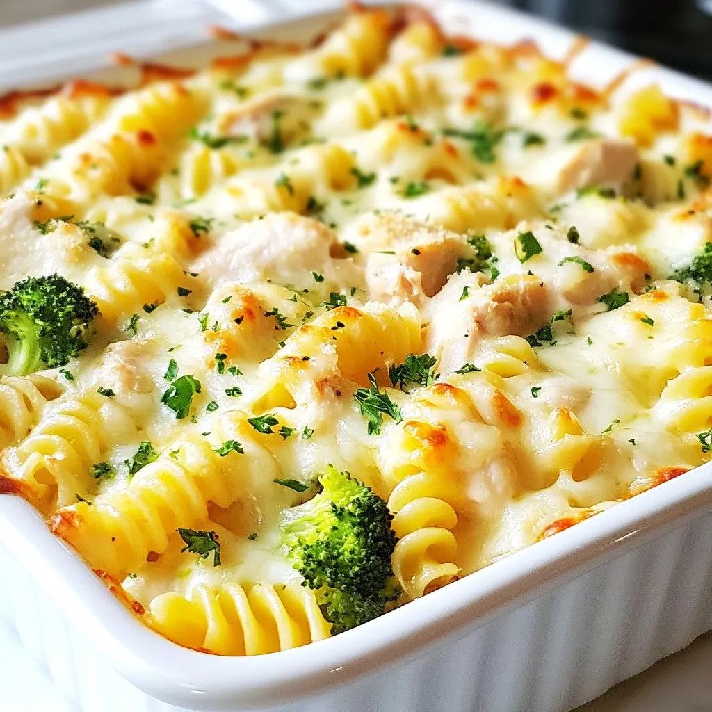 A delicious and easy chicken Alfredo casserole made with rotini pasta, chicken, broccoli, and creamy Alfredo sauce.