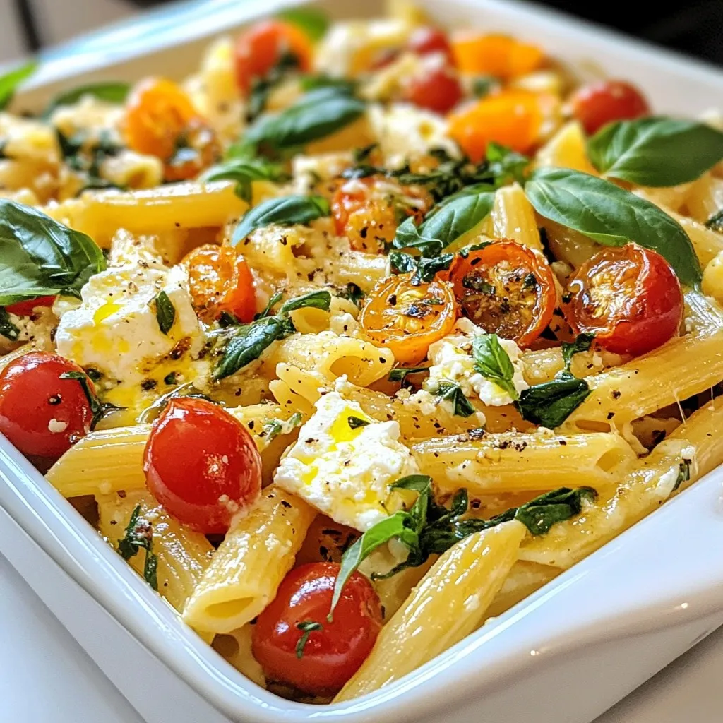 A delicious baked pasta dish featuring feta cheese, cherry tomatoes, and spinach.