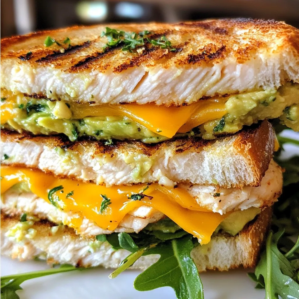 A delicious sandwich featuring seasoned chicken, creamy avocado spread, and melted cheddar cheese.