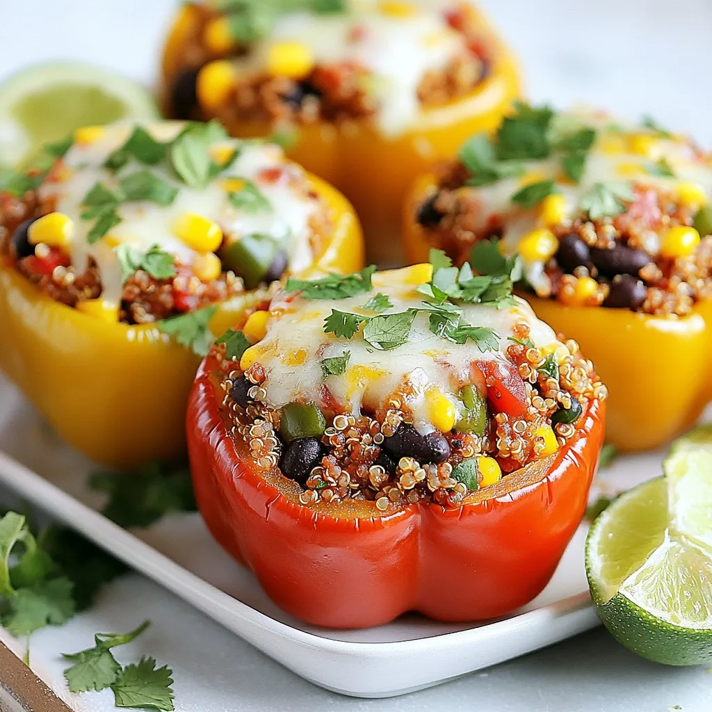 Each ingredient adds its own flair. The bell peppers serve as a tasty vessel. Quinoa gives a nutty flavor and a nice texture. Black beans add protein and a creamy bite. Corn brings sweetness and crunch. Diced tomatoes with green chilies give a zesty kick. The spices—cumin, chili powder, and smoked paprika—bring warmth and depth. Cheese melts into a gooey, savory topping. Finally, cilantro and lime add brightness when you serve the dish.