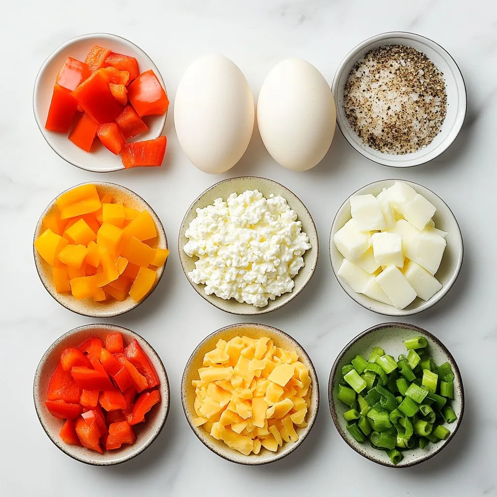 When I make fluffy cottage cheese egg muffins, I gather these fresh ingredients. Start with six large eggs. I prefer using small curd cottage cheese for a creamier texture. Then, I add half a cup of shredded cheddar cheese. This cheese gives the muffins a rich, savory taste.