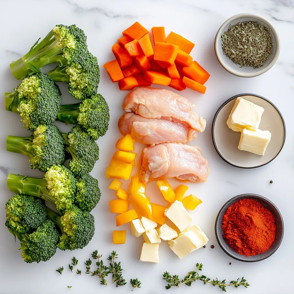 First, preheat your oven to 400°F (200°C). This step is key for even cooking. Next, gather your ingredients. You need four boneless, skinless chicken breasts, butter, garlic, broccoli, carrots, and bell peppers. Don’t forget your seasonings like paprika and thyme. They add great flavor!