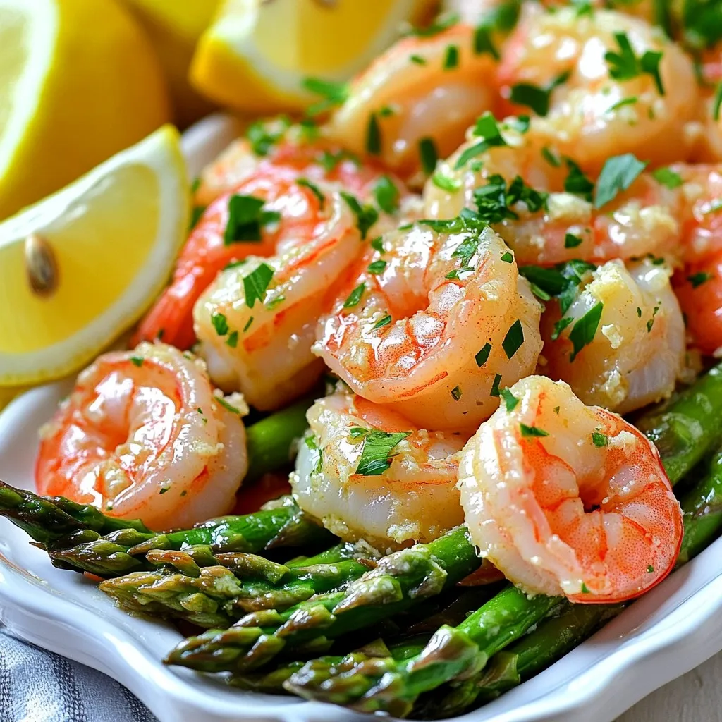 - 1 pound large shrimp, peeled and deveined - 1 bunch asparagus, trimmed and cut into 2-inch pieces - 4 tablespoons unsalted butter, melted - 4 cloves garlic, minced - 1 teaspoon lemon zest (freshly grated) - 2 tablespoons fresh lemon juice - 1 teaspoon paprika - 1 teaspoon dried oregano - Salt and pepper to taste - 1 tablespoon olive oil - Fresh parsley, chopped for garnish - Lemon wedges for serving When I make garlic butter shrimp and asparagus, I love to gather fresh ingredients. The shrimp should be large and firm. This gives the dish a great texture. I prefer using fresh asparagus. It adds a nice crunch and bright color. The garlic and butter are the stars here. I use unsalted butter to control the salt. Fresh garlic gives a strong flavor. Lemon zest and juice brighten the dish. Paprika adds a hint of warmth, while oregano brings an earthy taste. I keep salt and pepper handy. They are key for balancing flavors. Olive oil helps the asparagus roast well. Fresh parsley is perfect for a pop of color. I always serve lemon wedges on the side. They add a fresh zing that enhances the dish. With these ingredients, you are on your way to creating a flavorful, vibrant meal that impresses every time. Set your oven to 400°F (200°C). This temperature helps cook the shrimp and asparagus just right. Line a large baking sheet with parchment paper or foil. This step makes cleanup easy. In a big mixing bowl, add the melted butter, minced garlic, lemon zest, and lemon juice. Then, sprinkle in paprika, oregano, and a pinch of salt and pepper. Whisk everything well until you see a smooth mix. This garlic butter will add great flavor to the shrimp. Now, add the shrimp to the bowl with the garlic butter. Toss them gently so every shrimp gets coated. Let the shrimp marinate for about 10 minutes. This time helps them soak in all the yummy flavors while you prep the asparagus. Take another mixing bowl and add the trimmed asparagus pieces. Drizzle them with olive oil and sprinkle with salt and pepper. Toss until every piece is coated. This step makes sure the asparagus cooks well and tastes great. Pour the seasoned asparagus onto one side of the baking sheet. Place the marinated shrimp on the other side in a single layer. Giving them space helps them cook evenly. If you have any leftover garlic butter mixture, drizzle it over both the shrimp and asparagus for extra flavor. Put the baking sheet in your preheated oven. Bake for 12-15 minutes. The shrimp will turn pink and opaque, while the asparagus will be tender but still crisp. Keep an eye on them to avoid overcooking. When baked, take the sheet out of the oven. Sprinkle chopped fresh parsley over the dish for a pop of color and flavor. Serve right away with lemon wedges on the side for a zesty kick. To cook shrimp just right, focus on timing. Shrimp cook fast. They turn pink and opaque when done. Overcooking makes them tough. I suggest cooking shrimp for 12 to 15 minutes in the oven. Watch for that color change. If you see it, they are ready! For asparagus, keep that crisp texture. Trim the ends to remove the tough parts. Cook until bright green and tender but not mushy. If you bake it with the shrimp, check after 10 minutes. It should still have a slight crunch. If it bends easily, it's perfect! To impress, serve the shrimp and asparagus on a large plate. Drizzle leftover garlic butter on top. It adds flavor and looks great. Scatter fresh parsley for color, and add lemon wedges on the side. This makes the dish pop! Enjoy this lovely meal with friends or family. {{image_4}} You can switch the shrimp for other seafood. Scallops and salmon work nicely. Both add rich flavor and texture. If you like a firmer bite, scallops are great. For a meatier option, salmon gives a nice twist. Want to change the taste? Add fresh herbs like basil or dill. These herbs bring a nice twist and fresh aroma. You can also try spices like cumin or chili powder for a kick. Just adjust to your taste for a fun mix. Need a gluten-free version? Use gluten-free soy sauce instead of regular. For a dairy-free meal, swap the butter for olive oil or a vegan butter. This way, everyone can enjoy this dish without worry. To keep your garlic butter shrimp and asparagus fresh, store leftovers in an airtight container. Place the dish in the fridge within two hours of cooking. This will help preserve flavor and texture. Try to eat the leftovers within three days for the best taste. If you notice any odd smells or changes in texture, it's best to throw them away. When reheating, avoid making the shrimp tough. Use the oven for best results. Preheat it to 350°F (175°C). Place the shrimp and asparagus on a baking sheet. Add a splash of olive oil to keep them moist. Heat for about 10 minutes. You can also use a microwave, but be careful. Heat in short bursts to avoid overcooking. You can freeze leftovers for later enjoyment. First, let the dish cool completely. Then, place it in a freezer-safe container or bag. Remove as much air as possible to prevent freezer burn. It can last up to three months in the freezer. To enjoy, thaw it overnight in the fridge before reheating. Cooking garlic butter shrimp takes about 12 to 15 minutes. I set my oven to 400°F (200°C) to get the best results. The shrimp should turn pink and opaque. The asparagus should be tender yet crisp. Keep an eye on both to avoid overcooking. Yes, you can use frozen shrimp. Just thaw them first. Place the shrimp in cold water for about 15 minutes. Pat them dry before marinating. This helps the flavors stick better. Fresh shrimp will give a better taste, but frozen works fine in a pinch. I love serving rice or quinoa with this dish. They soak up the garlic butter nicely. You can also pair it with a light salad or crusty bread. These sides balance the meal and add freshness. Look for the shrimp to change color. They should be pink and opaque. If they curl tightly, they are likely cooked. A good rule is to take them out when they are jus
