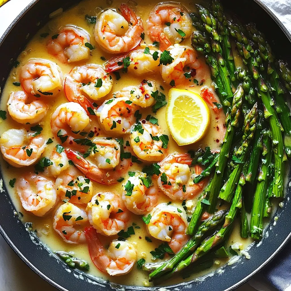- 1 lb large shrimp, peeled and deveined - 1 bunch of asparagus, trimmed and cut into 2-inch pieces - 4 tablespoons unsalted butter - 3 cloves garlic, minced These main ingredients form the heart of the dish. The shrimp adds protein and sweetness, while asparagus brings crunch and color. Butter gives richness, and garlic adds that wonderful aroma. - 1 teaspoon red pepper flakes - Juice of 1 lemon (about 2 tablespoons) - Salt and pepper to taste Adding red pepper flakes gives the dish a nice kick. Lemon juice brightens the flavors. Salt and pepper are key to elevating the taste of the shrimp and asparagus. - 2 tablespoons fresh parsley, chopped Fresh parsley not only adds color but also a hint of freshness. It makes the dish look elegant and inviting. With these ingredients, you create a simple yet flavorful meal in no time. The balance of flavors and textures makes Garlic Butter Shrimp and Asparagus Skillet a true delight. First, grab a large skillet and set it on medium heat. Add 2 tablespoons of unsalted butter. Watch as it melts and becomes foamy. This step adds flavor and richness to our dish. Next, toss in 3 cloves of minced garlic and 1 teaspoon of red pepper flakes. Stir this mix for about a minute. You want the garlic to smell amazing but not brown. Time to add the star of the dish: 1 pound of peeled and deveined shrimp. Season them well with salt and pepper. This helps bring out their natural taste. Cook the shrimp for about 2-3 minutes on each side. You’ll know they’re done when they turn pink and opaque. Once cooked, remove them from the skillet and set them aside. Now, it’s time for the asparagus. In the same skillet, add the other 2 tablespoons of butter. Let it melt, then add the trimmed asparagus cut into 2-inch pieces. Sauté the asparagus for 5-7 minutes. Stir often until they are bright green and still a bit crisp. After the asparagus cooks, return the shrimp to the skillet. Squeeze the juice of 1 lemon over the mixture. This adds a fresh zing. Toss everything together gently, allowing the flavors to blend. Cook for another 2 minutes to heat it all through. Remove from heat, and sprinkle with chopped fresh parsley for a nice touch. Enjoy your Garlic Butter Shrimp & Asparagus! To achieve the perfect sauté, start with a hot skillet. Heat the skillet over medium heat. Add two tablespoons of unsalted butter and let it melt. Once it foams, add minced garlic and red pepper flakes. Stir them for one minute until fragrant. This step adds depth to your dish. For juicy shrimp, choose large, fresh shrimp. Peel and devein them before cooking. Season them well with salt and pepper. Cook them for just 2-3 minutes on each side. When they turn pink and opaque, they'll be perfectly tender. For side dishes, serve Garlic Butter Shrimp with rice or crusty bread. Both soak up the tasty sauce. A fresh salad or roasted potatoes also pairs well. When presenting, use a large platter. Arrange the shrimp and asparagus nicely. Garnish with lemon wedges and fresh parsley. This adds color and makes it more inviting. To modify spice levels, adjust the red pepper flakes. Use less for a milder dish. You can also add a pinch more for extra heat. For alternative seasonings, consider using paprika or lemon zest. Both add unique flavors. Fresh herbs like thyme or basil can enhance your dish further. Experiment to find the mix you love! {{image_4}} You can switch the shrimp for other proteins. Chicken works great, too. Just cut it into bite-sized pieces. Tofu is another option for a plant-based dish. It absorbs flavors well. You can also add different vegetables. Bell peppers add color and crunch. Broccoli is another tasty choice. It cooks nicely and pairs well with the sauce. Feel free to mix and match to suit your taste. This dish can easily fit gluten-free diets. Use gluten-free soy sauce for added flavor. It keeps the dish tasty without the gluten. For a paleo-friendly option, skip the butter. Use olive oil instead. It gives a nice flavor and keeps it healthy. This way, you can still enjoy a flavorful meal. Adding herbs can give depth to your dish. Fresh basil or thyme works well. They add bright notes to the garlic butter. You can also play with sauce flavors. Adding a splash of white wine can make it richer. It brings a nice acidity that balances the dish. Just remember to adjust the cooking time slightly to let the alcohol cook off. To keep your Garlic Butter Shrimp and Asparagus fresh, use airtight containers. Glass or plastic containers work well. Make sure they seal tightly to avoid air. This dish lasts about 3 days in the fridge. When you want to enjoy leftovers, the best way is to use a skillet. Heat it on low, then add the shrimp and asparagus. Stir gently to warm them up. This keeps the texture nice. You can also use a microwave. Heat in short bursts to avoid overcooking. You can freeze Garlic Butter Shrimp and Asparagus. Place it in a freezer-safe container. Make sure to remove as much air as possible. It will last about 2 months in the freezer. To thaw, move it to the fridge overnight. You can also use cold water for faster thawing. Once thawed, reheat in a skillet for the best taste. How long does it take to cook garlic butter shrimp? Cooking garlic butter shrimp takes about 10 minutes. You will sauté the shrimp for 2-3 minutes on each side. They will turn pink and opaque when done. This quick cooking method keeps them tender. Can I use frozen shrimp for this recipe? Yes, you can use frozen shrimp. Just thaw them first. Place them in cold water for about 15 minutes. Pat them dry before cooking to avoid excess water in the skillet. What can I use instead of asparagus? If you don’t have asparagus, try green beans or broccoli. Both will give you a nice crunch and flavor. You can also use zucchini, but cook it for less time. Is there a dairy-free version of this recipe? Absolutely! To make this dish dairy-free, use olive oil instead of butter. You can also use vegan butter for a simil
