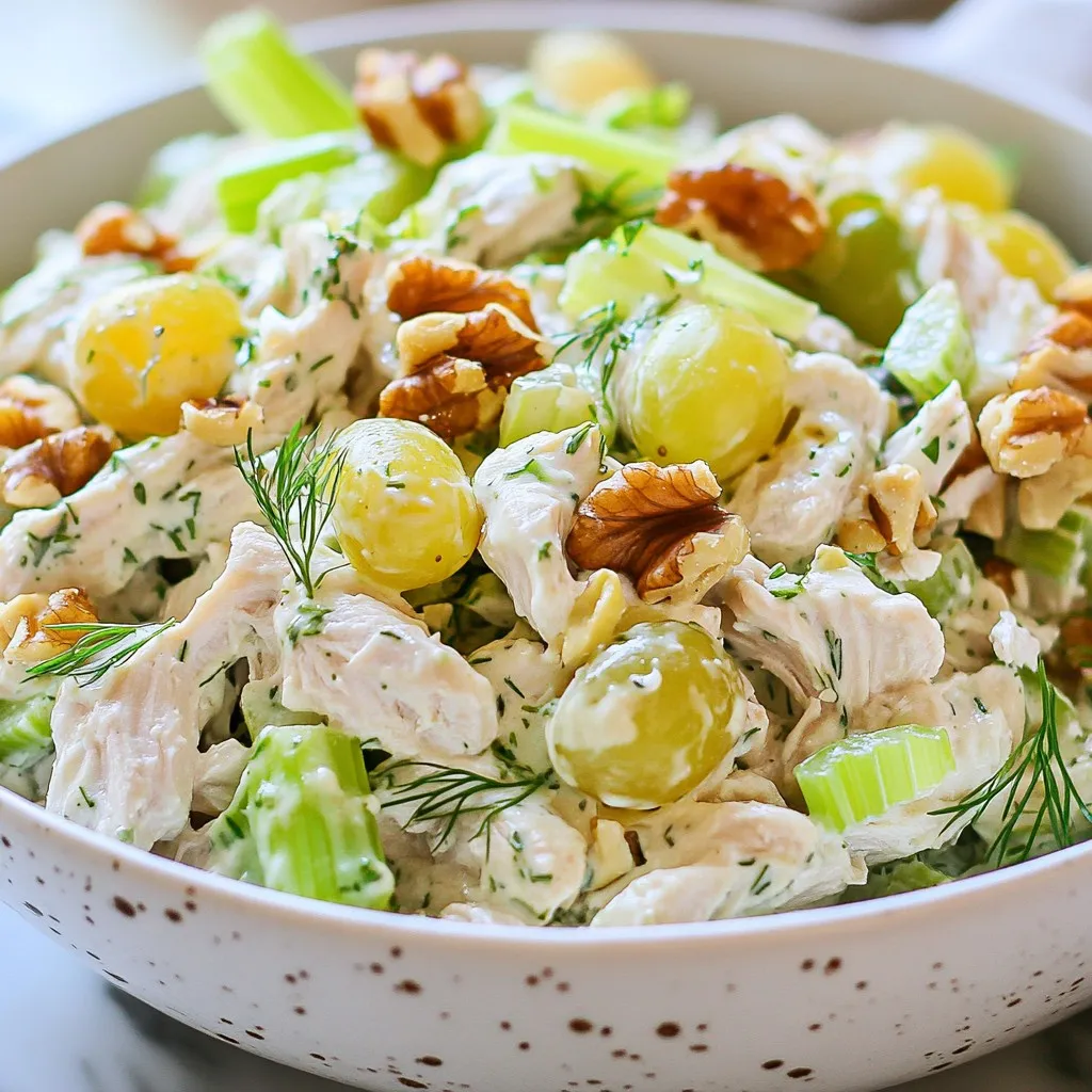 To make this tasty Greek yogurt chicken salad, you'll need a few key ingredients: - 2 cups cooked chicken breast, shredded - 1 cup plain Greek yogurt - 1/2 cup celery, diced - 1/2 cup red grapes, halved - 1/4 cup walnuts, chopped - 1/4 cup green onions, sliced - 2 tablespoons fresh dill, chopped - 1 tablespoon lemon juice - Salt and pepper to taste These ingredients bring together great flavors and textures. The chicken makes it hearty. Greek yogurt adds creaminess without extra fat. Celery gives a nice crunch, while grapes add sweet bursts. Walnuts add a satisfying crunch, and dill brings freshness. Green onions add a mild bite. You can mix in a few optional ingredients to make it your own: - Diced apples for a sweet twist - Chopped bell peppers for extra color - Cucumber for a refreshing crunch - A dash of hot sauce for a bit of spice Feel free to experiment! These choices can change the flavor and texture to match your taste. Select the best ingredients for your salad. Here are some tips: - Choose fresh chicken breast. It should have a light pink color. - Use plain Greek yogurt. Look for one with no added sugar. - Pick firm, crisp celery. Avoid any that feels limp. - Choose grapes that are plump and firm. They should have a vibrant color. - Select whole walnuts. They should smell fresh and nutty. Using high-quality ingredients makes your salad taste amazing. Don't rush this step; it’s worth the effort! {{ingredient_image_1}} To start, gather all your ingredients. You will need: - 2 cups cooked chicken breast, shredded - 1 cup plain Greek yogurt - 1/2 cup celery, diced - 1/2 cup red grapes, halved - 1/4 cup walnuts, chopped - 1/4 cup green onions, sliced - 2 tablespoons fresh dill, chopped - 1 tablespoon lemon juice - Salt and pepper to taste Begin by shredding your cooked chicken. You can use leftover chicken or cook it fresh. Next, chop the celery, grapes, walnuts, and green onions. Use a sharp knife to make clean cuts. This helps with texture. Fresh dill adds a nice touch, so chop it finely. In a large mixing bowl, add the shredded chicken and Greek yogurt. Mix them well. You want the chicken fully coated in yogurt. Next, add the diced celery, halved grapes, chopped walnuts, and sliced green onions to the bowl. Each ingredient adds a unique flavor. Sprinkle the fresh dill in and drizzle the lemon juice over the top. Season with salt and pepper. Mix gently. Be careful not to break the grapes. They add sweetness and color. After mixing, cover the bowl with plastic wrap. Place it in the fridge for at least 30 minutes. This waiting time helps the flavors blend. This salad is versatile. You can serve it chilled on its own. It also works well in a sandwich. Try it on a bed of mixed greens for a fresh look. You can even pair it with whole-grain crackers for a tasty snack. Enjoy experimenting with different serving styles! Meal prep makes cooking easier. Start by shredding your cooked chicken. You can use rotisserie chicken for quick prep. Next, chop your veggies and nuts. Keep them fresh in separate containers. This way, you can mix your salad when you’re ready. Make it a day ahead for even better flavor. To boost the taste, add fresh herbs like dill and parsley. Lemon juice adds a nice zing. A splash of vinegar can also brighten the dish. Think about adding spices like paprika or garlic powder. These small touches make a big difference. For a sweet note, try adding a bit of honey. One big mistake is over-mixing. Gently combine the ingredients to keep the grapes whole. Another error is not seasoning enough. Always taste and adjust your salt and pepper. Don't skip the chilling step. Letting the salad sit helps the flavors blend well. Lastly, avoid using low-quality yogurt. A creamy, full-fat Greek yogurt gives the best taste and texture. Pro Tips Use Leftover Chicken: This recipe is perfect for using up leftover rotisserie or grilled chicken, saving both time and effort. Experiment with Herbs: Feel free to substitute or add other fresh herbs like parsley or basil for a different flavor profile. Make it Ahead: Prepare the salad a day in advance for even better flavor as the ingredients meld together overnight. Serving Suggestions: Serve it on whole grain bread, in lettuce wraps, or as a dip with crackers for a versatile meal option. {{image_2}} You can easily change ingredients in this Greek yogurt chicken salad. If you want a creamier texture, swap Greek yogurt for sour cream. You can use any cooked chicken, like rotisserie or leftover grilled chicken. If you're not a fan of walnuts, try pecans or almonds for crunch. Want a bit of heat? Add some diced jalapeños. You can create many flavor profiles with this salad. For a Mediterranean twist, add olives and sun-dried tomatoes. If you like a sweet twist, mix in diced apples or dried cranberries. For a smoky flavor, try smoked paprika or chipotle seasoning. Each change gives you a new taste adventure! If you're looking for a low-carb option, replace chicken with shredded tofu or chickpeas. You can also use cauliflower rice for a lighter base. For a vegan version, switch Greek yogurt with a plant-based yogurt. There are many tasty options out there. Just make sure to pick a yogurt that has a thick texture. To keep your Greek yogurt chicken salad fresh, use an airtight container. Place the salad in the container and seal it well. This helps to lock in the flavors and moisture. Store it in the fridge. It tastes best when eaten cold. I do not recommend freezing this salad. The Greek yogurt may change texture when thawed. This can make your salad watery or grainy. If you need to save some, try to use it within a few days instead. Greek yogurt chicken salad lasts about three to four days in the fridge. Make sure to check for any signs of spoilage before eating. If it smells off or looks strange, it's best to toss it. Always label your container with the date to keep track. Yes, you can use rotisserie chicken. It saves time and adds flavor. Just 