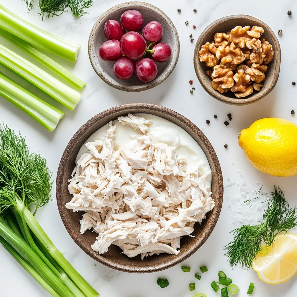 These ingredients bring together great flavors and textures. The chicken makes it hearty. Greek yogurt adds creaminess without extra fat. Celery gives a nice crunch, while grapes add sweet bursts. Walnuts add a satisfying crunch, and dill brings freshness. Green onions add a mild bite.