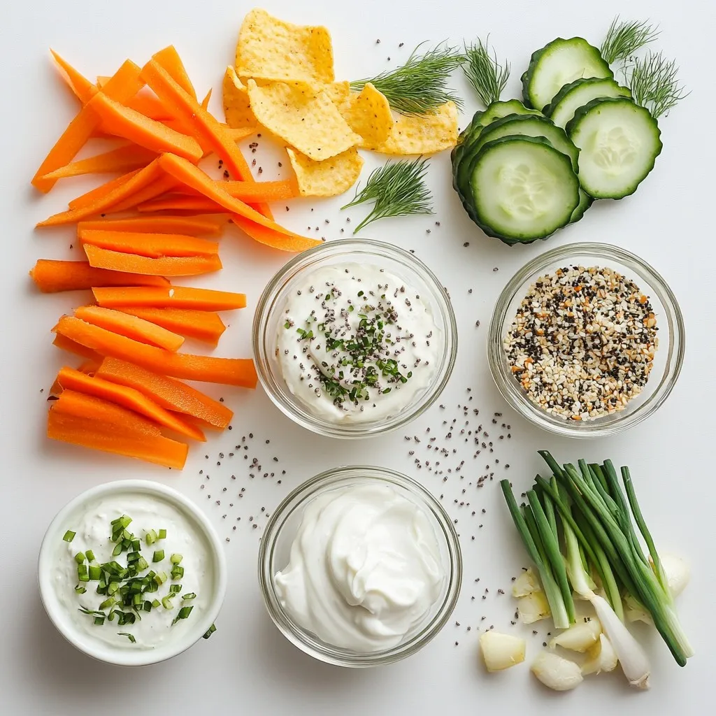 A creamy and flavorful dip made with Greek yogurt and everything bagel seasoning, perfect for serving with fresh vegetables and bagel chips.