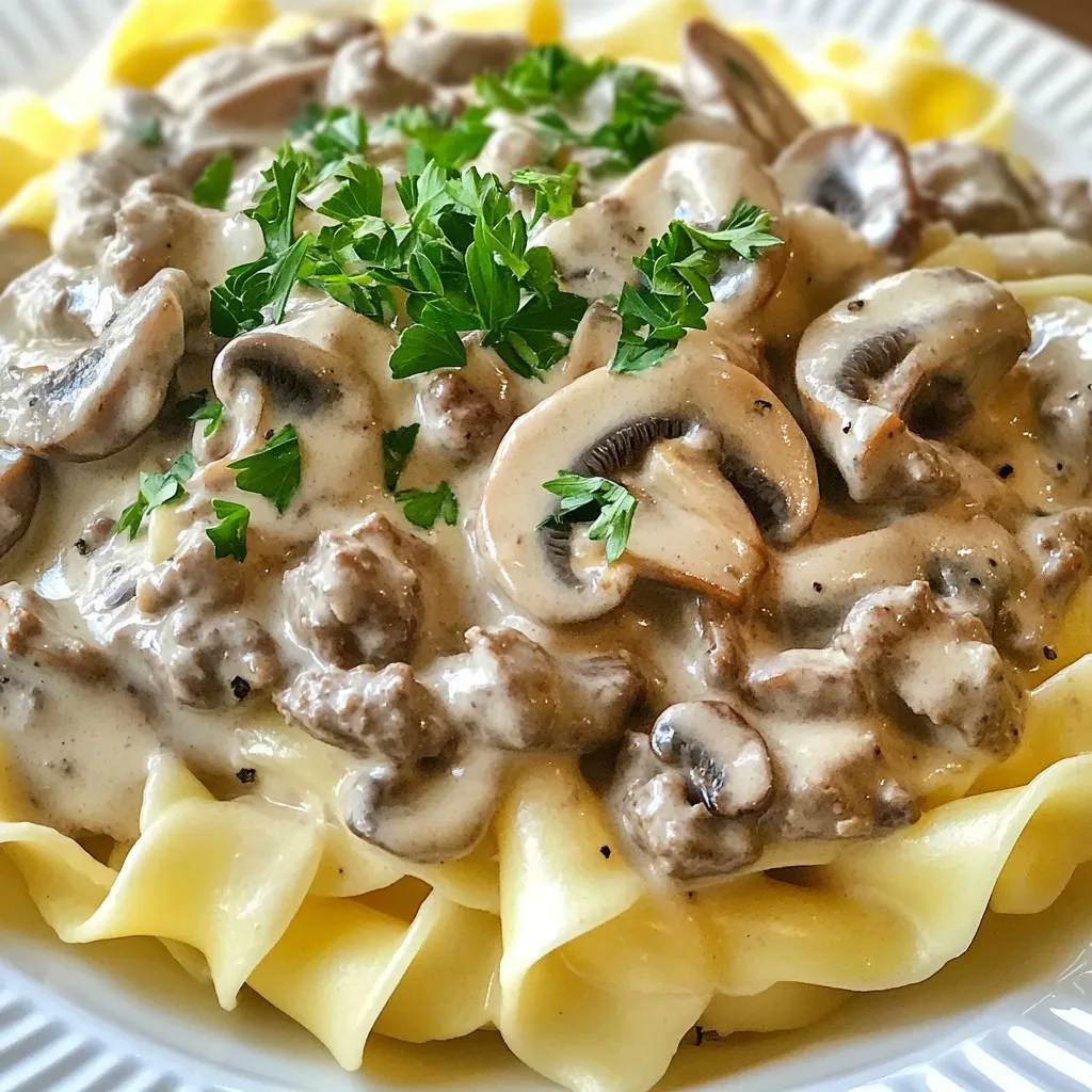 A rich and creamy beef stroganoff served over egg noodles, perfect for a comforting meal.