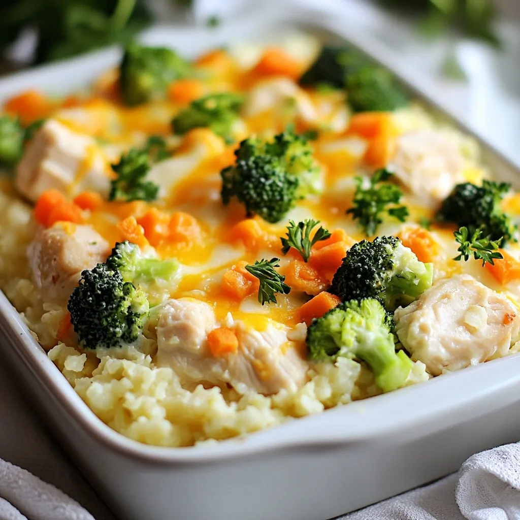 - 1 pound boneless, skinless chicken breast, diced - 4 cups cauliflower rice (fresh or frozen) - 1 cup broccoli florets, steamed - 1 cup shredded carrots - 1 cup low-sodium chicken broth - 1 teaspoon garlic powder - 1 teaspoon onion powder - 1 teaspoon Italian seasoning - 1 cup shredded mozzarella cheese - 1 cup light cream cheese, softened - Fresh parsley - Additional seasoning To make this healthy chicken cauliflower rice casserole, gather these simple ingredients. The chicken provides lean protein, while cauliflower rice adds fiber and nutrients. Broccoli florets and carrots bring color and vitamins to the dish. For flavor, garlic powder, onion powder, and Italian seasoning work well together. Cream cheese gives a smooth texture, and mozzarella on top creates a delicious, cheesy crust. You can add fresh parsley as a garnish for a pop of green. Using low-sodium chicken broth helps keep the dish light and healthy. If you want to mix things up, try adding your favorite herbs or spices as extra seasoning. {{ingredient_image_1}} - Preheat your oven to 375°F (190°C). This helps the casserole cook evenly. - In a large skillet, cook 1 pound of diced chicken breast over medium heat. Stir until the chicken is no longer pink, about 7-10 minutes. Season with garlic powder, onion powder, Italian seasoning, salt, and pepper. This adds great flavor to your dish. - In a large mixing bowl, combine the cooked chicken, 4 cups of cauliflower rice, 1 cup of steamed broccoli florets, and 1 cup of shredded carrots. Add 1 cup of low-sodium chicken broth. Mix well to ensure everything is even. - Stir in 1 cup of softened light cream cheese. This will give your casserole a smooth and creamy texture. Make sure it’s fully mixed in. - Transfer the mixed ingredients to a greased 9x13 inch casserole dish. Spread it evenly so it cooks well. - Sprinkle 1 cup of shredded mozzarella cheese on top of the casserole. This will melt into a delicious, bubbly layer. - Bake for 20-25 minutes until the cheese is bubbly and golden brown. This creates a nice crust on top. To make your Healthy Chicken Cauliflower Rice Casserole taste great, think about herbs and spices. I suggest using: - Garlic powder - Onion powder - Italian seasoning These add depth and warmth. You can also use homemade chicken broth. It gives a richer taste than store-bought options. If you want to make this dish even healthier, consider low-calorie substitutions. For example, use Greek yogurt instead of cream cheese. This swap adds protein and cuts calories. You can also add more veggies. Try bell peppers, spinach, or zucchini. These not only boost nutrition but also add color. Avoiding sogginess in your casserole is key. To do this, don’t overcook the cauliflower rice. If you use frozen rice, make sure it's thawed and drained well. For a creamy consistency, mix the cream cheese thoroughly. This helps it blend smoothly with the other ingredients. A well-mixed casserole will have a nice, creamy feel, making each bite enjoyable. Pro Tips Use Fresh Ingredients: Fresh vegetables and chicken can enhance the flavor and nutritional value of your casserole. Customize Your Veggies: Feel free to add or substitute any vegetables you like, such as bell peppers or spinach, for variety. Make It Ahead: Prepare the casserole ahead of time, cover it, and store it in the fridge. Bake it when you're ready to eat! Store Leftovers Properly: Keep any leftovers in an airtight container in the fridge for up to 3 days, and reheat in the oven or microwave. {{image_2}} You can change the protein in this dish. Instead of chicken, try turkey or tofu. Both options work well and add their own flavor. For cheese, swap mozzarella for cheddar or pepper jack. These choices give the casserole a new twist. Making this dish gluten-free is easy. Just ensure you use gluten-free broth. If you need a dairy-free version, substitute light cream cheese with cashew cream or a dairy-free spread. These swaps keep the casserole creamy and delicious. Want more heat? Sprinkle in some red pepper flakes or cayenne. This adds a nice kick. For a different vibe, think about adding spices from other cuisines. Try cumin and chili powder for a Mexican flair, or curry powder for an Indian touch. Each option brings a unique taste to your casserole. To keep your casserole fresh, store leftovers in the fridge. Use airtight containers. Glass or plastic containers both work well. Let the casserole cool before sealing it. This helps prevent moisture build-up. You can freeze this casserole for later. First, let it cool completely. Then, cut it into portions. Place each portion in freezer-safe bags or containers. Be sure to remove excess air before sealing. When you're ready to eat, thaw in the fridge overnight. Reheat in the oven at 350°F until hot. In the fridge, the casserole lasts about 3-4 days. In the freezer, it can stay good for about 2-3 months. Always check for any signs of spoilage before eating. Cauliflower rice is made by grating or processing cauliflower into small pieces. It looks like rice but is much lower in carbs. Nutritional benefits Cauliflower rice is low in calories. It is high in vitamins C and K. It also provides fiber, which is good for digestion. Using cauliflower rice helps cut carbs while adding nutrients. How to prepare it To prepare cauliflower rice, you can buy it fresh or frozen. If using fresh, wash and chop the cauliflower into florets. Then, pulse it in a food processor until it resembles rice. If using frozen, simply thaw it in the microwave or on the stove. Yes, you can make this casserole ahead of time. It stores well in the fridge and tastes great after being reheated. Tips for meal prepping To prep ahead, follow the recipe up to the baking step. Cover the casserole tightly and store it in the fridge for up to two days. This keeps the flavors fresh. Reheating instructions When ready to eat, preheat your oven to 375°F (190°C). Uncover the casserole and bake for 20-25 minutes un