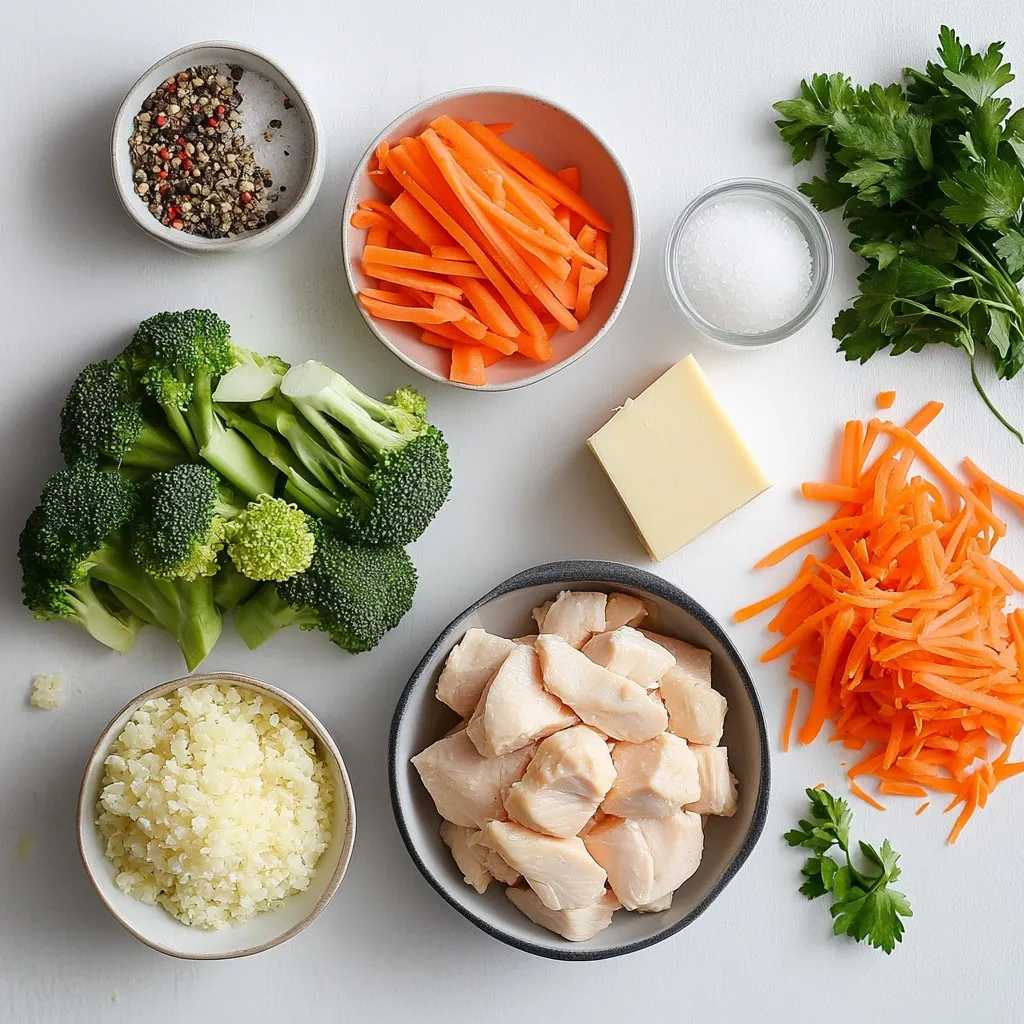 To make this healthy chicken cauliflower rice casserole, gather these simple ingredients. The chicken provides lean protein, while cauliflower rice adds fiber and nutrients. Broccoli florets and carrots bring color and vitamins to the dish.