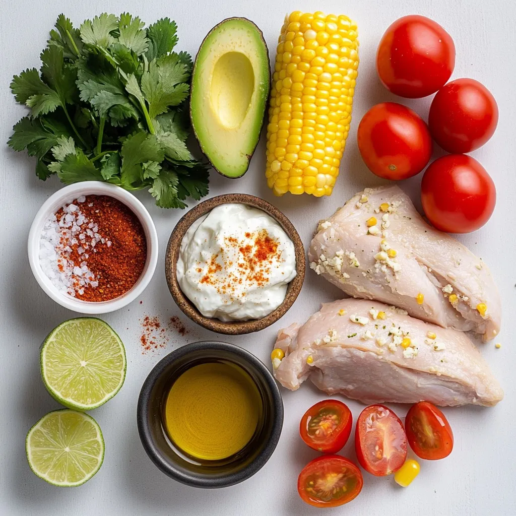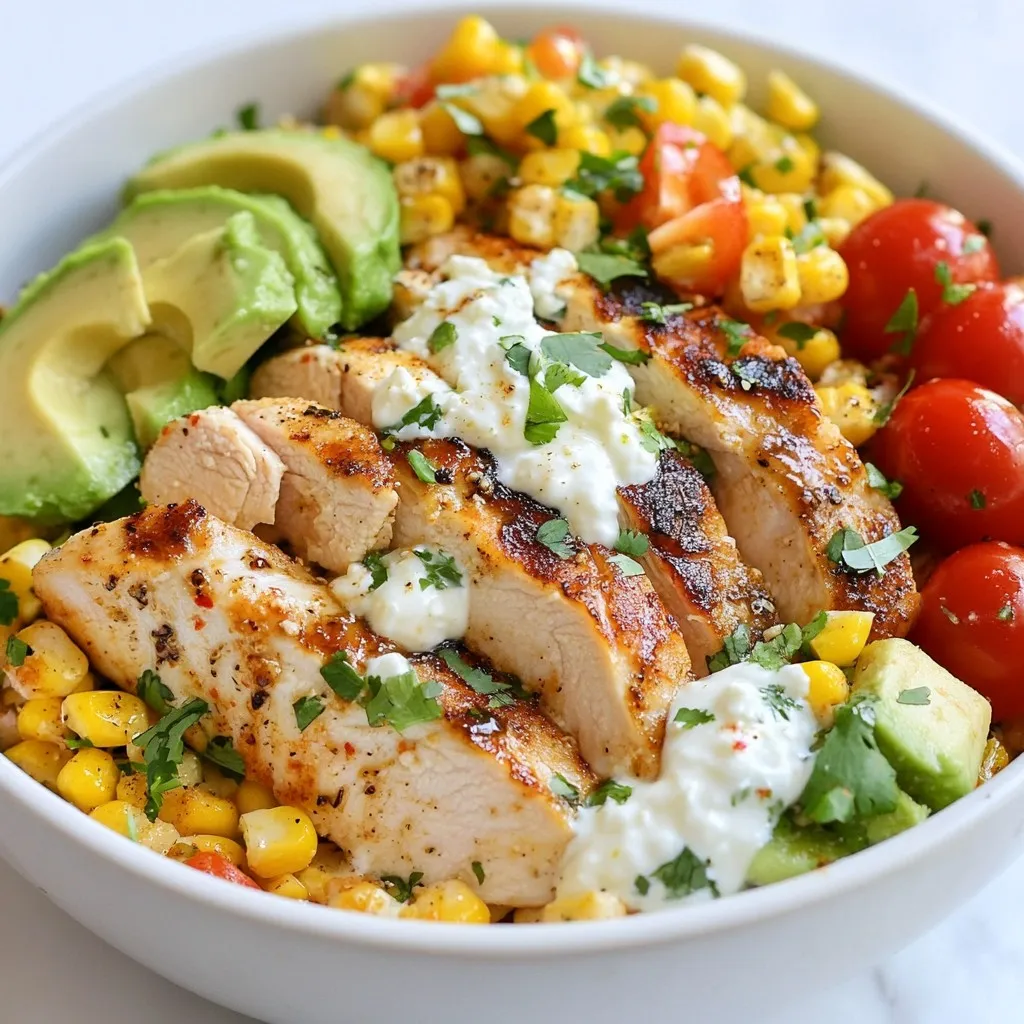 Time to build your bowl! Start with sliced chicken as your base. Then layer on the charred corn, diced avocado, halved cherry tomatoes, and crumbled cotija cheese. Drizzle your yogurt-lime sauce over the top. This makes it look colorful and appetizing. Arrange the ingredients nicely so every bite has a bit of everything.