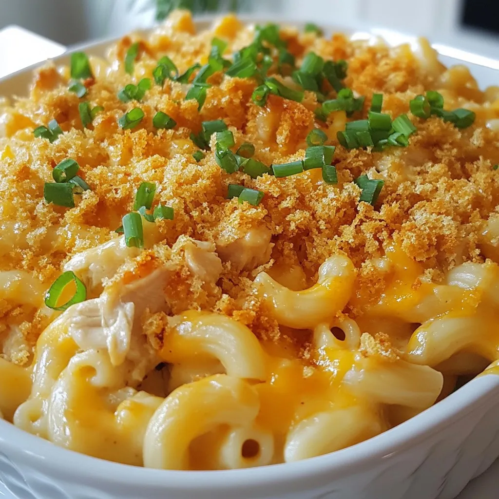 A delicious and creamy mac and cheese dish with shredded chicken and honey BBQ sauce, topped with crispy panko breadcrumbs.