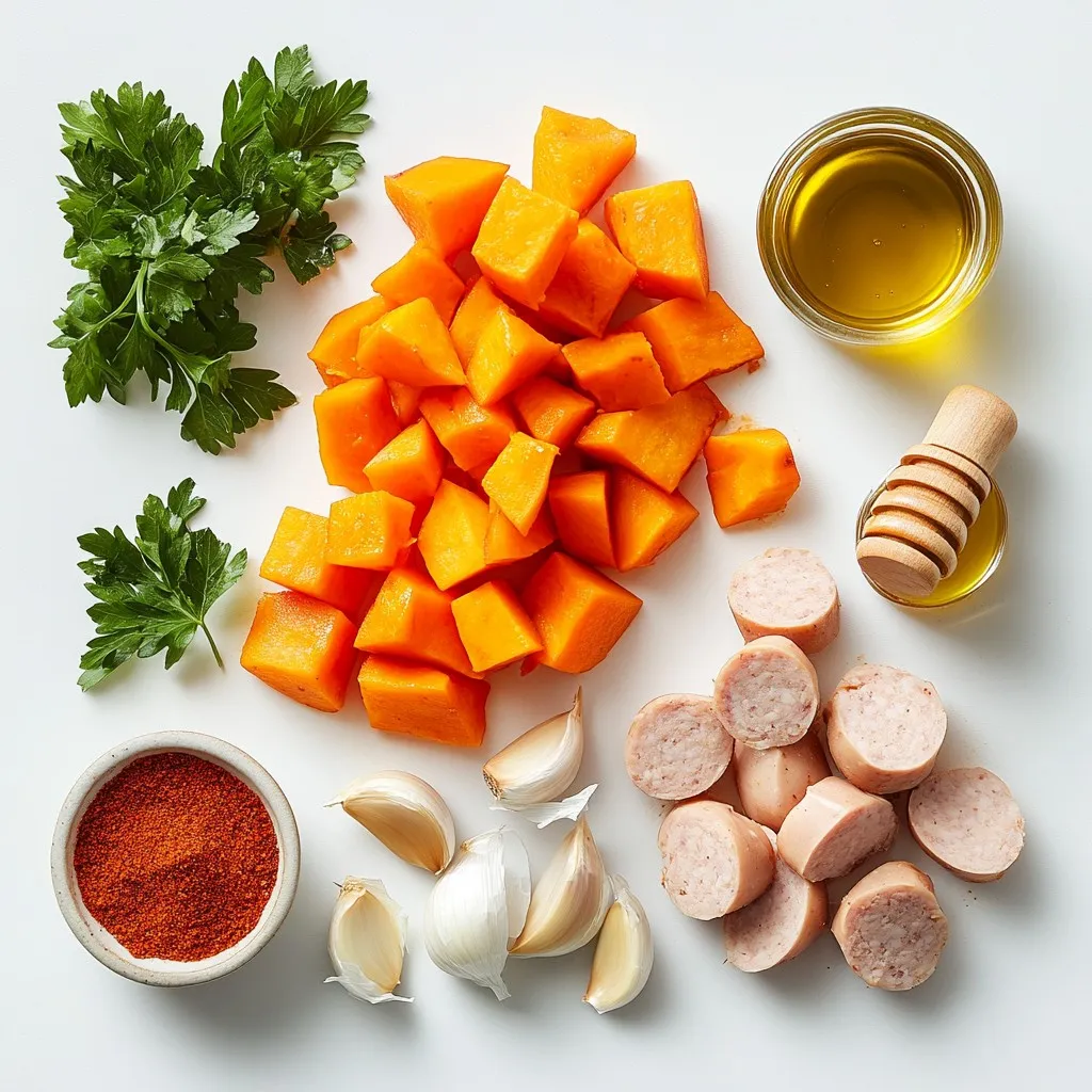 Start by gathering your ingredients. You need chicken sausage, sweet potatoes, a red bell pepper, an onion, garlic, honey, olive oil, smoked paprika, salt, and pepper.