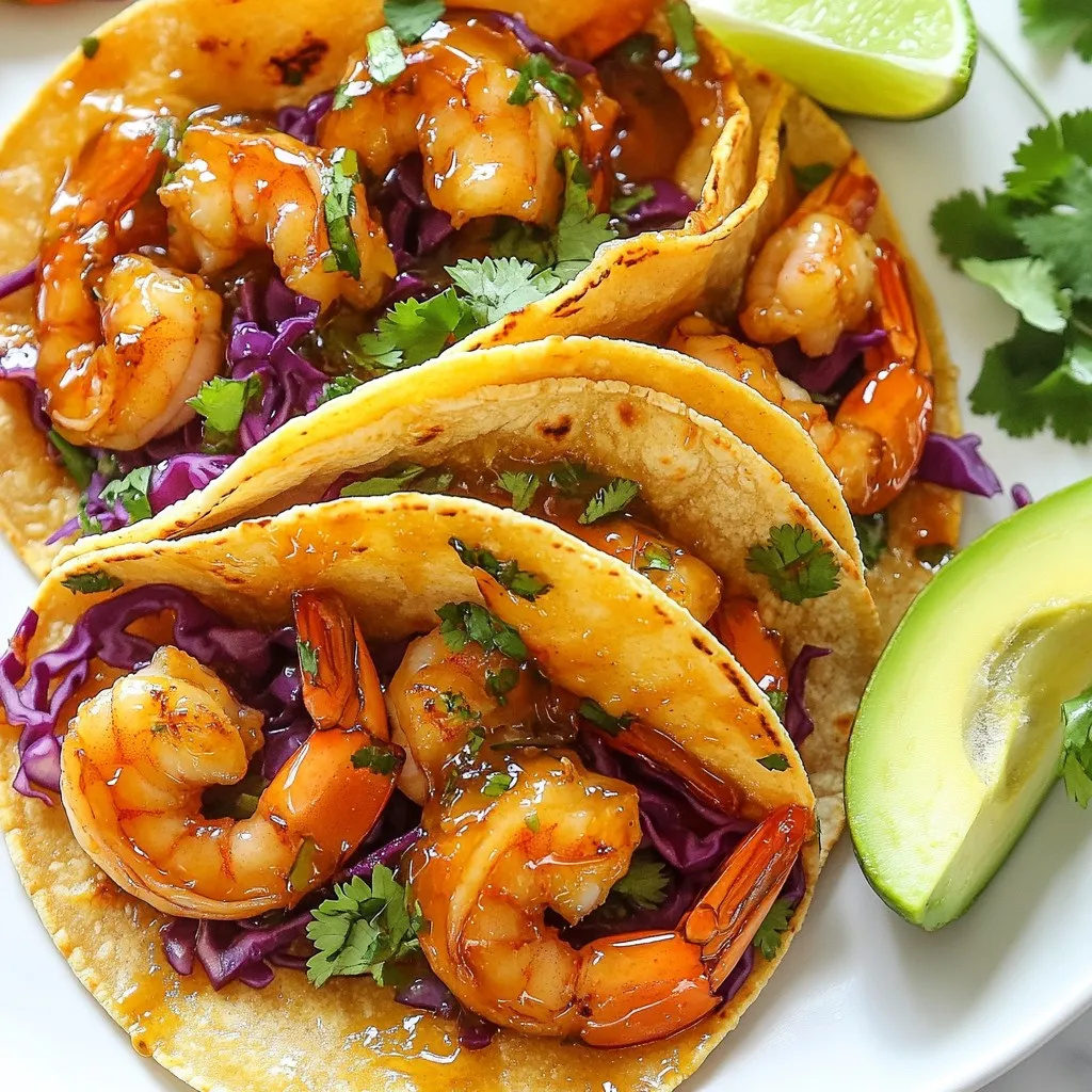 For the best taco assembly, warm the tortillas in a separate skillet. Heat them for about 30 seconds on each side to make them pliable. Start by placing a few shrimp in the center of each tortilla. Add a handful of thinly sliced red cabbage for crunch. Then, top with avocado slices for creaminess. Finish with fresh cilantro and a squeeze of lime. This makes each bite burst with flavor.