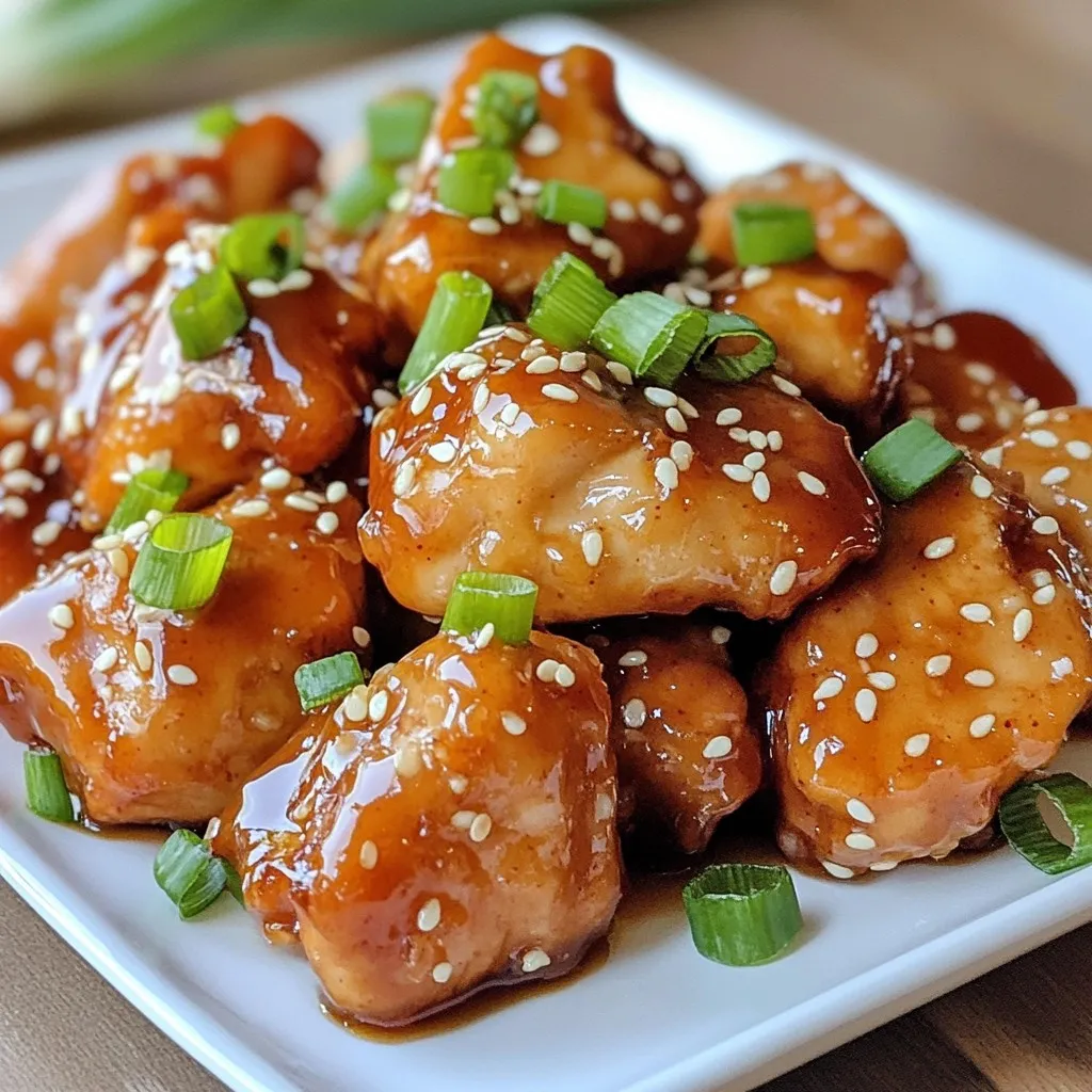 - 1 lb (450g) chicken breast, cut into bite-sized pieces - 1/4 cup honey - 1/4 cup soy sauce (low sodium) These main ingredients make the dish shine. Chicken breast gives you juicy bites. Honey adds sweetness and a lovely glaze. Soy sauce brings depth and saltiness that balances the honey. - 3 cloves garlic, minced - 1 tablespoon grated fresh ginger - 1/4 teaspoon black pepper Garlic gives a robust flavor. Fresh ginger adds a warm spice. Black pepper rounds out the taste with its subtle heat. Together, these flavorings create a delicious base. - 1/4 teaspoon sesame seeds (for garnish) - 2 green onions, chopped (for garnish) Garnishes are key for presentation. Sesame seeds add crunch and visual appeal. Green onions bring a fresh taste and vibrant color to your dish. {{ingredient_image_1}} First, you will make the marinade. In a medium bowl, whisk together the following ingredients: - 1/4 cup honey - 1/4 cup soy sauce (low sodium) - 3 cloves garlic, minced - 1 tablespoon grated fresh ginger - 1 tablespoon cornstarch - 1/4 teaspoon black pepper Whisk until smooth. The cornstarch helps thicken the sauce later. Next, place the chicken pieces in a resealable bag or a bowl. Pour the marinade over the chicken. Make sure all pieces are coated well. Seal the bag or cover the bowl. Refrigerate for at least 30 minutes. For the best taste, marinate for up to 2 hours. Now, heat 2 tablespoons of vegetable oil in a large skillet over medium-high heat. Once the oil is hot, add the marinated chicken pieces to the pan. Remember to save the marinade for later. Cook the chicken for about 5 to 7 minutes. Turn the chicken pieces occasionally. They should be golden brown and fully cooked. After the chicken is cooked, pour the reserved marinade into the skillet. Bring it to a simmer over medium heat. Allow the sauce to bubble for about 3 to 5 minutes. This simmering helps the sauce thicken and become sticky. Once done, the sauce should coat the chicken beautifully. Remove the skillet from heat and let the chicken cool for one minute before serving. To get that perfect sticky glaze, use cornstarch. Cornstarch helps thicken the sauce. This gives it a rich and glossy finish. Add the cornstarch when you mix the marinade. This step is key for that sticky texture you want. Adjust your cooking time too. If your heat is too high, the sauce may burn. Cook it slowly to let the glaze develop nicely. Marinating is important for flavor. I suggest marinating for at least 30 minutes. For even better taste, let it sit for up to 2 hours. This allows the chicken to soak up all the yummy flavors. Use a resealable plastic bag for easy mixing. You can also use a bowl with a lid. Just make sure all the chicken gets coated well. For a nice presentation, serve the chicken on a big platter. Drizzle any extra sauce over the top. Garnish with sesame seeds and chopped green onions. This adds color and crunch. Pair the chicken with steamed rice or a fresh salad. These sides balance the meal and make it more filling. Pro Tips Perfect Marinade Time: Allow the chicken to marinate for at least 2 hours to enhance the flavor; overnight is even better! Thickening the Sauce: If you prefer a thicker sauce, add a little more cornstarch mixed with water to the simmering marinade until you reach your desired consistency. Cooking Temperature: Ensure your skillet is hot enough before adding the chicken; this will help achieve a nice golden crust. Serving Suggestions: These chicken bites pair well with steamed jasmine rice or a fresh green salad for a balanced meal. {{image_2}} You can change the sweetener if you want. Maple syrup or agave can work instead of honey. Both add a nice flavor. For proteins, you do not have to use chicken. You can swap it for tofu, pork, or even beef. Each option gives a new taste to the dish. Want some heat? Add chili flakes or sriracha to your sauce. This spice will give your chicken a kick. If you like citrus, try adding orange juice or lime juice. This will add brightness to the flavor. Both adjustments make the dish exciting and fun. You can make these chicken bites for meal prep. Just cook a big batch and store the extras. Use airtight containers to keep them fresh. If you want to freeze leftovers, place them in freezer bags. Be sure to remove air from the bags. When you are ready to eat, thaw them in the fridge overnight. Reheat them in a skillet for the best texture. Leftover Honey Garlic Sticky Chicken Bites last for up to three days in the fridge. To keep them fresh, place the chicken in an airtight container. Make sure the lid is on tight. This helps prevent air from drying out the chicken or altering its flavor. You can freeze these chicken bites for up to three months. First, allow the chicken to cool completely. Then, put them in a freezer-safe bag. Try to remove as much air as you can before sealing. This helps avoid freezer burn. When you're ready to eat, thaw the chicken bites in the fridge overnight. This keeps them juicy and tasty. To reheat, use a skillet over medium heat. Add a splash of water to keep the chicken moist. Cover the skillet with a lid. This helps steam the chicken and makes it sticky again. Heat for about 5-7 minutes or until warmed through. Avoid using a microwave, as it can dry out the chicken. Enjoy your tasty bites just like they were fresh! I recommend marinating the chicken for at least 30 minutes. For the best flavor, aim for 2 hours. This allows the chicken to soak up all the tasty honey and garlic. You can use a resealable bag or a bowl. Just make sure to coat every piece well with the marinade. Yes, you can make Honey Garlic Sticky Chicken Bites ahead of time. You can marinate the chicken the night before and store it in the fridge. When you're ready to cook, just heat the oil and follow the steps. If you have leftovers, you can reheat them in a skillet for a few minutes. This keeps them warm and sticky. These chicken bites pair well with many sides. Steamed rice is a classic choice